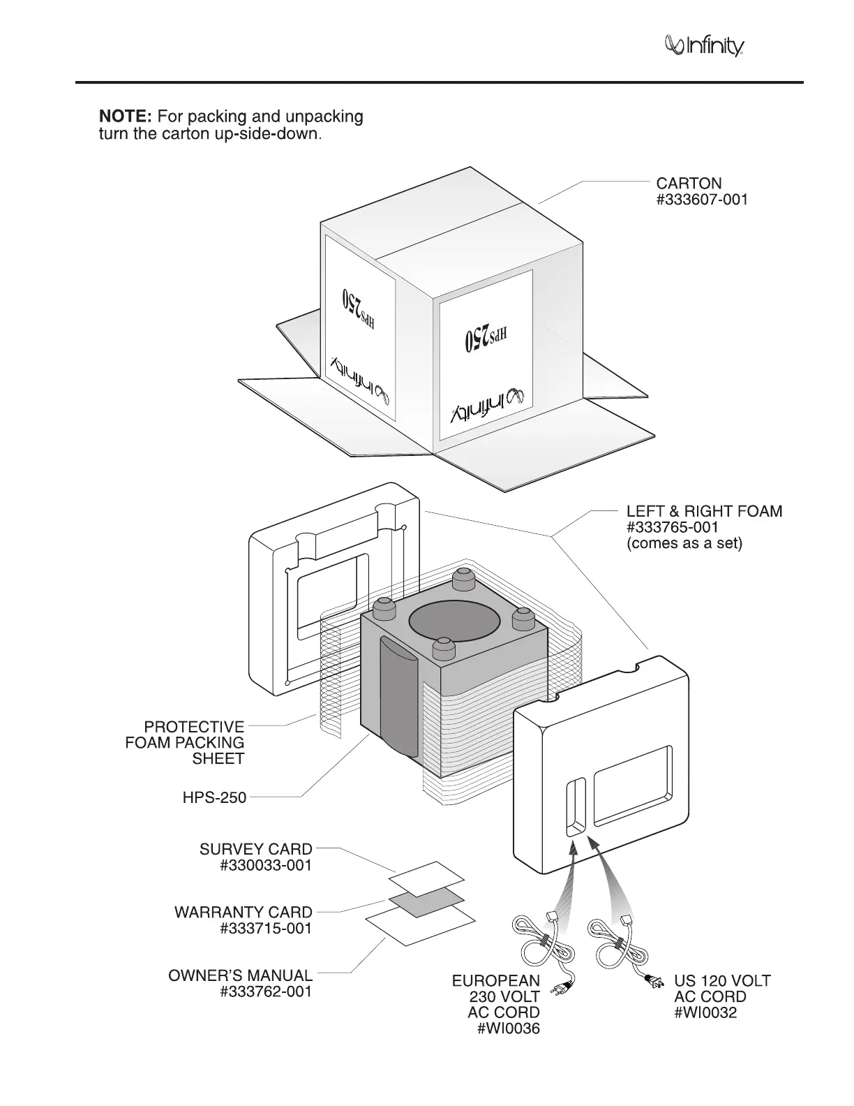 Infinity HPS250 - HPS-250 Packaging Exploded View; Carton and Foam Packaging Details; Packaging Accessory Items