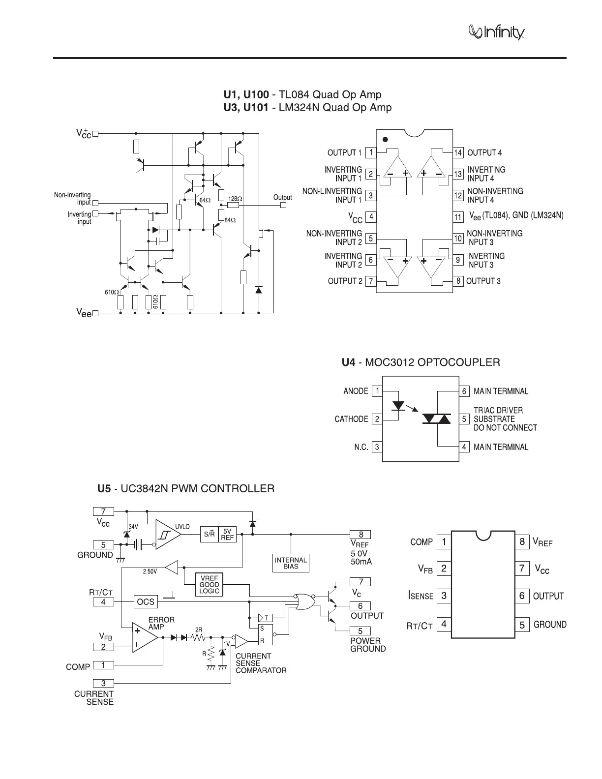 Infinity HPS250 - Integrated Circuit Diagrams; Op Amp IC Diagrams (TL084, LM324); Optocoupler IC Diagram (MOC3012); PWM Controller IC Diagram (UC3842 N)