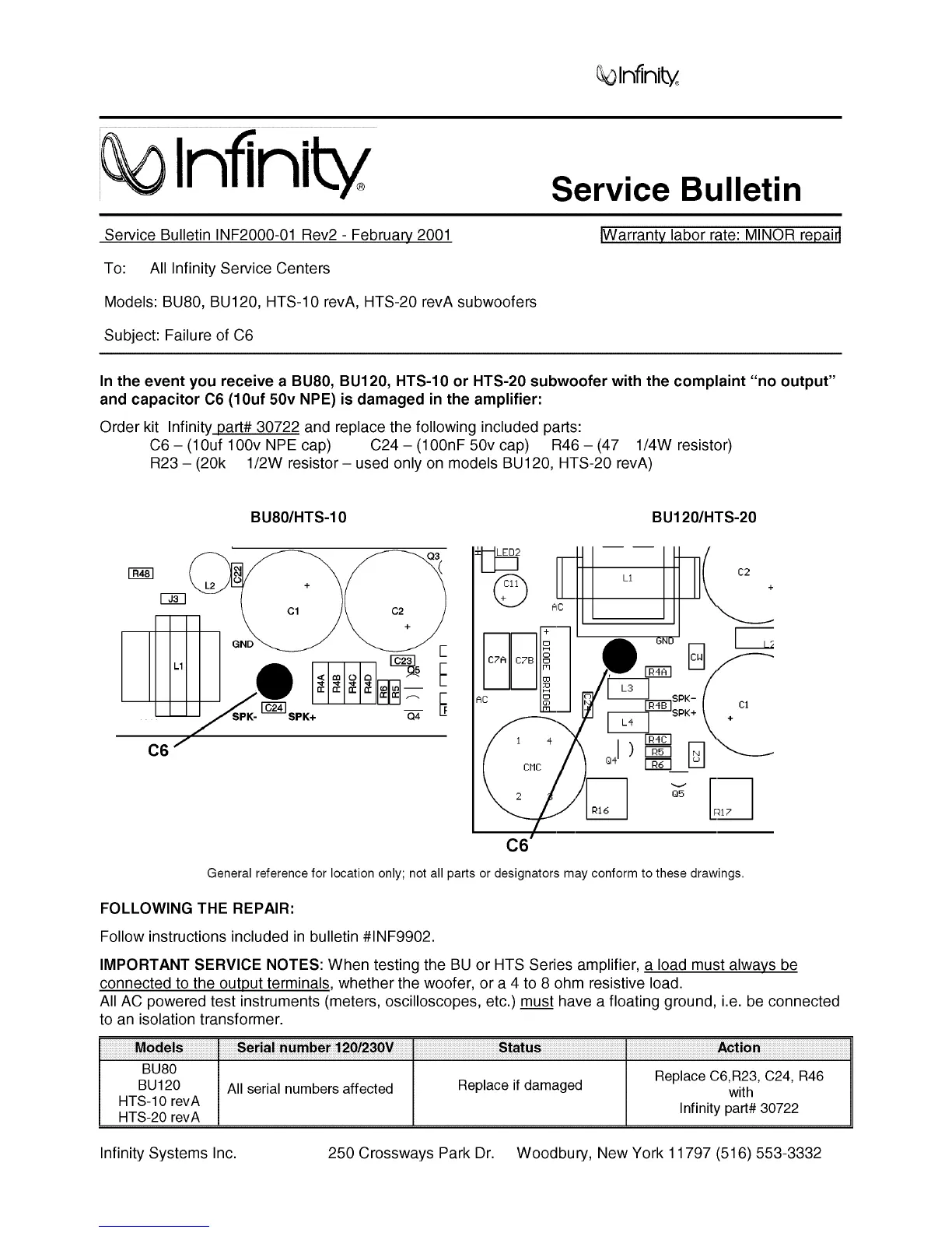 Infinity HTS-10 - Service Bulletin: C6 Capacitor Failure; Capacitor C6 Replacement Procedure