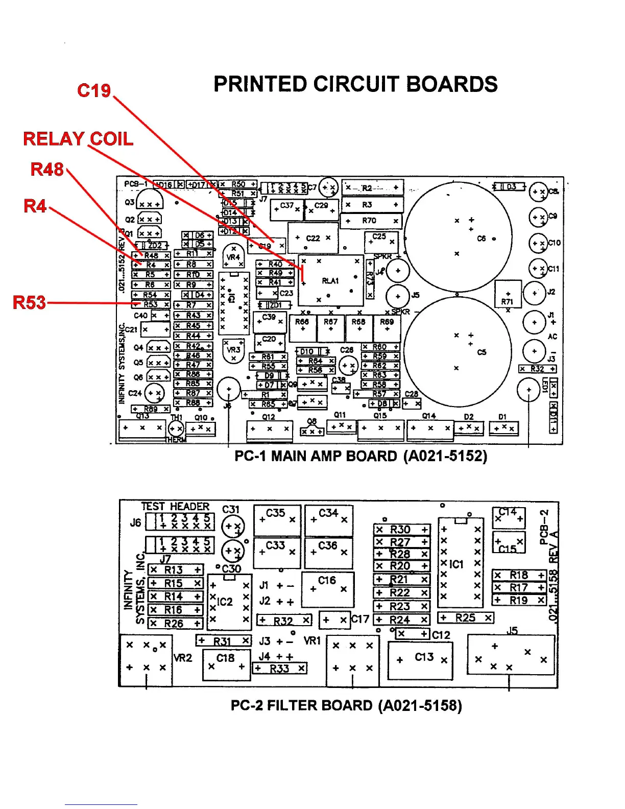 Infinity Infinitesimal IV - PRINTED CIRCUIT BOARD LAYOUTS; PC-1 Main Amplifier Board Diagram; PC-2 Filter Board Diagram