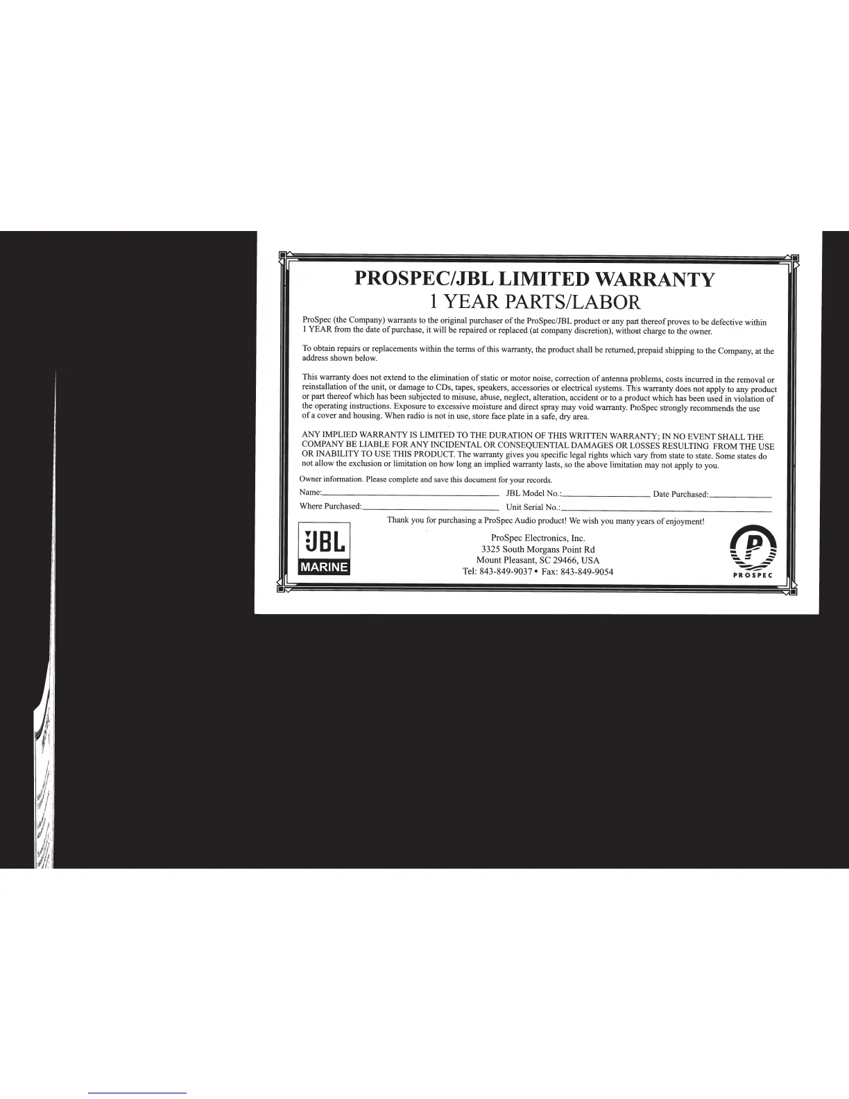 PROSPEC/JBL LIMITED WARRANTY