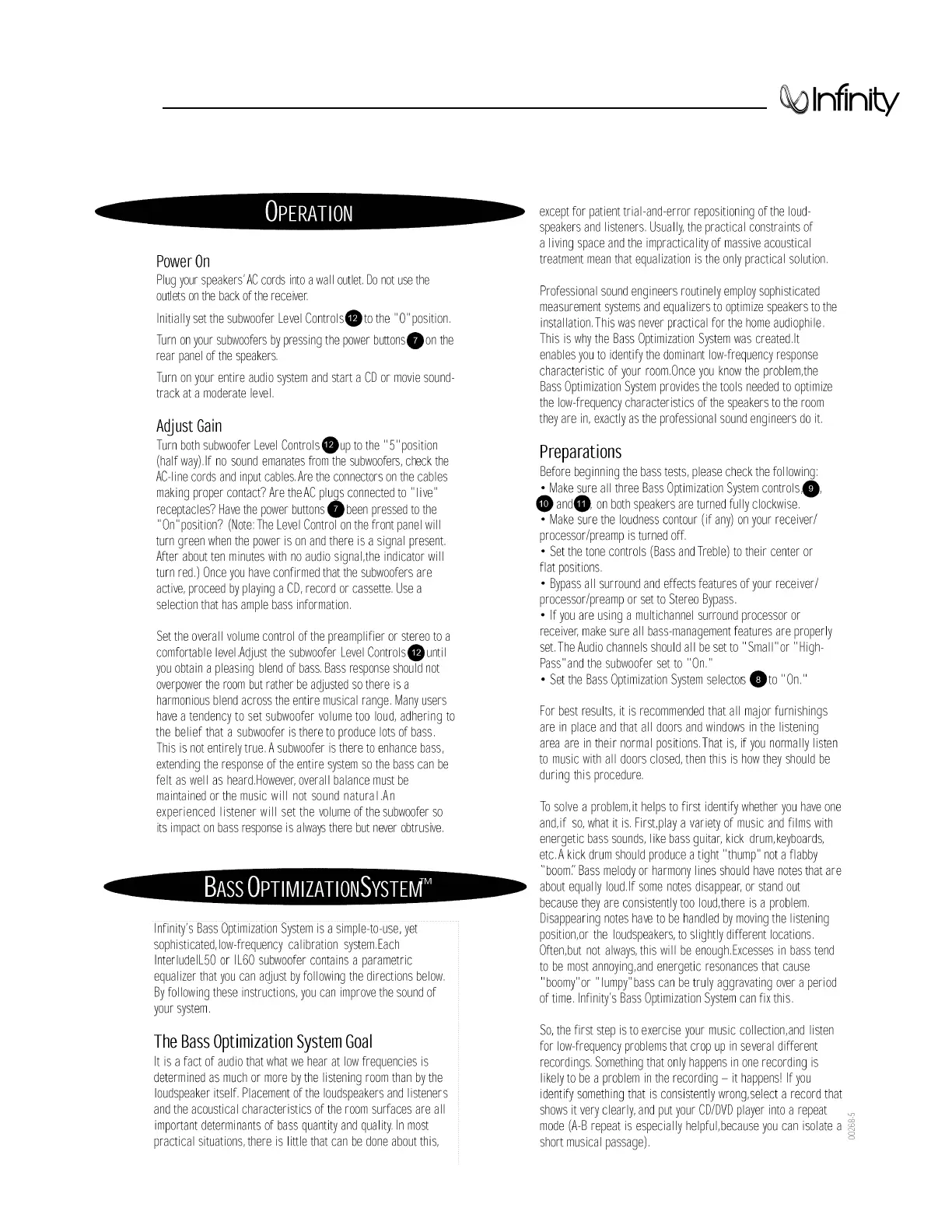 Infinity Interlude Series - Operation; Power On and Gain Adjustment; Bass Optimization System