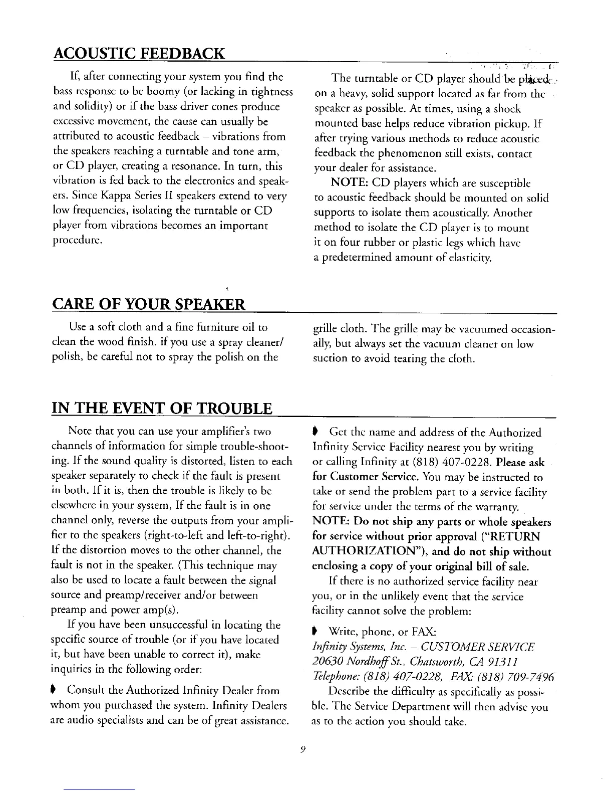 Infinity KAPPA 6.1 - Acoustic Feedback; Care of Your Speaker; In the Event of Trouble