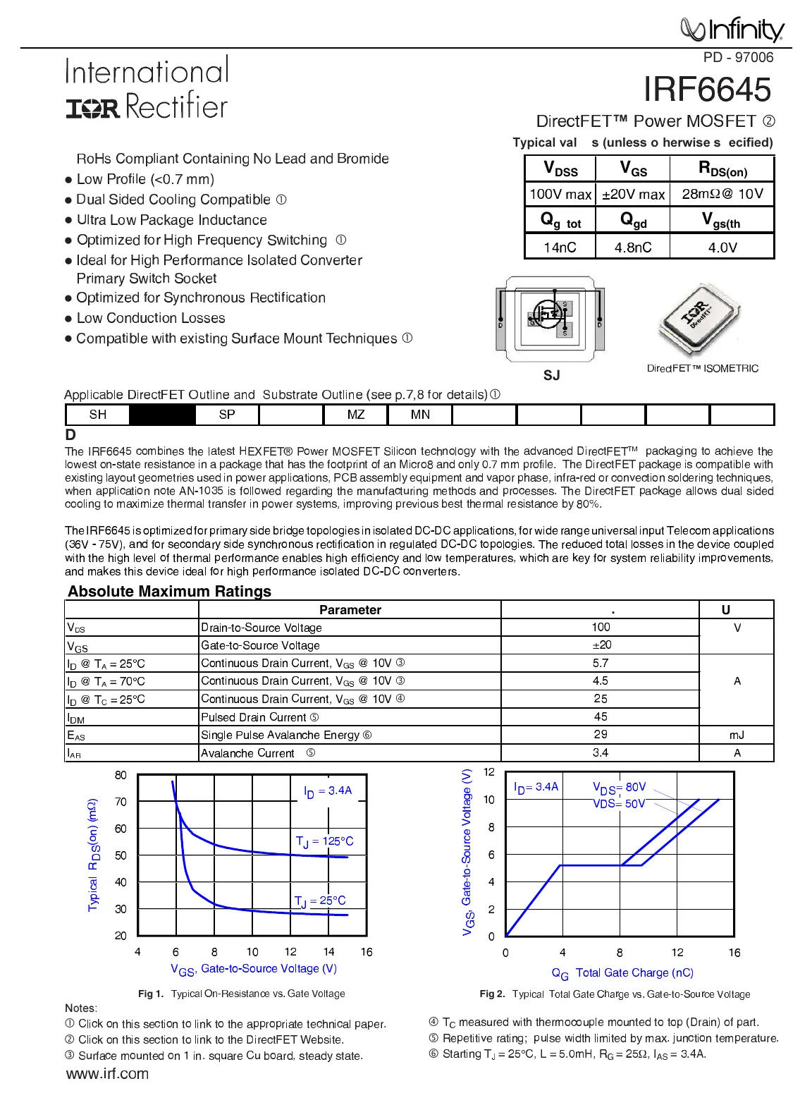 Infinity KAPPA FIVE - IRF6645 Power MOSFET; Features and Absolute Maximum Ratings; Typical Performance Graphs