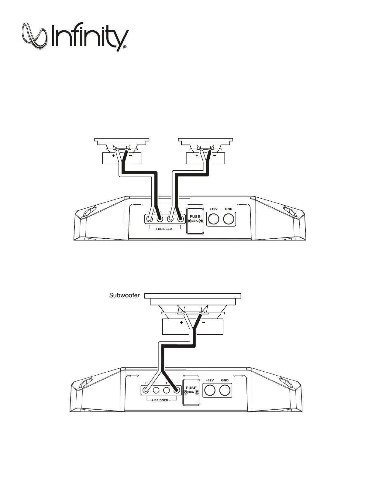 • For mono (bridged) operation connect the speaker’s positive (+) lead to the L+ terminal, and the negative (-) lead to the R- terminal.