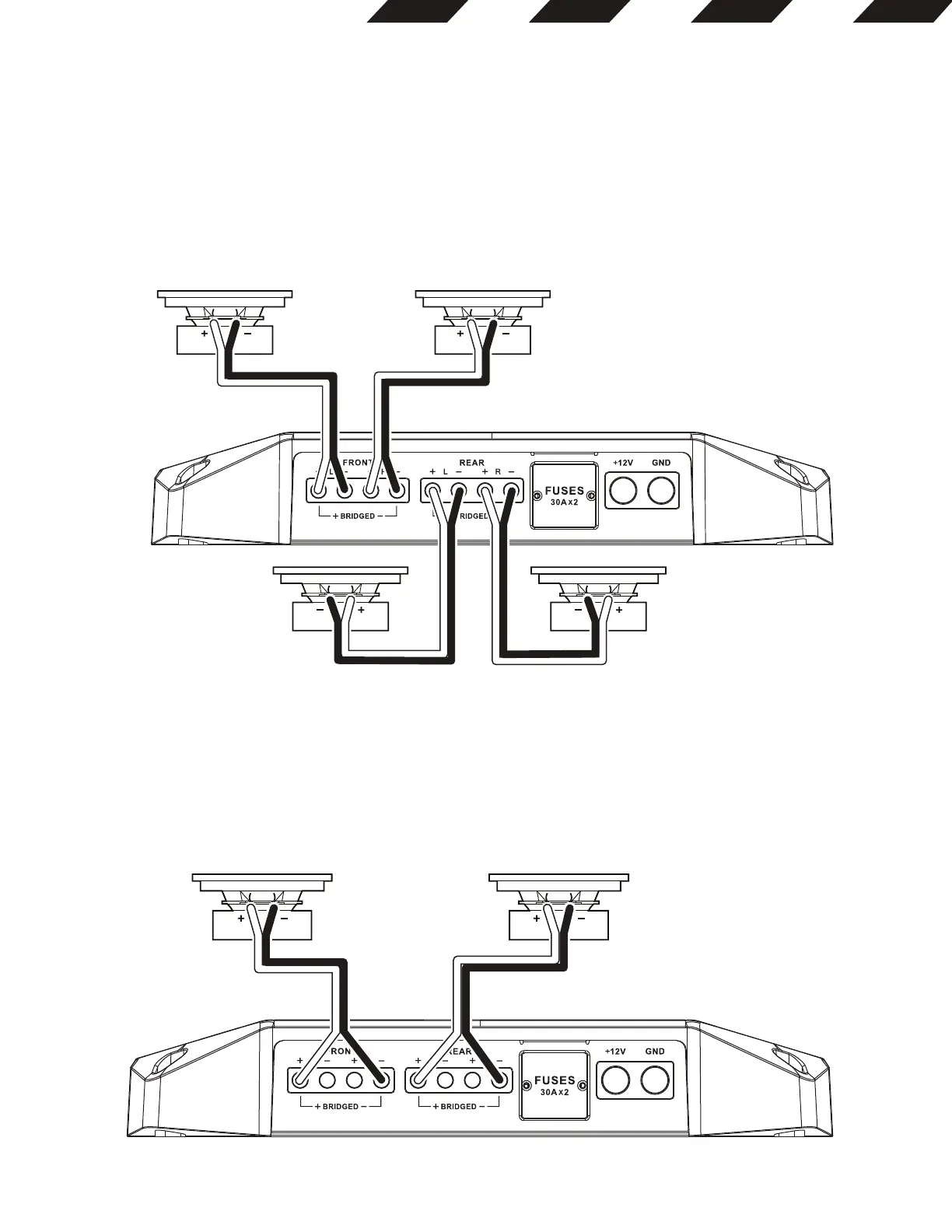• For 2-channel (bridged) operation connect one speaker’s + lead to the Front L+ terminal, and the - lead to the Front R- terminal.