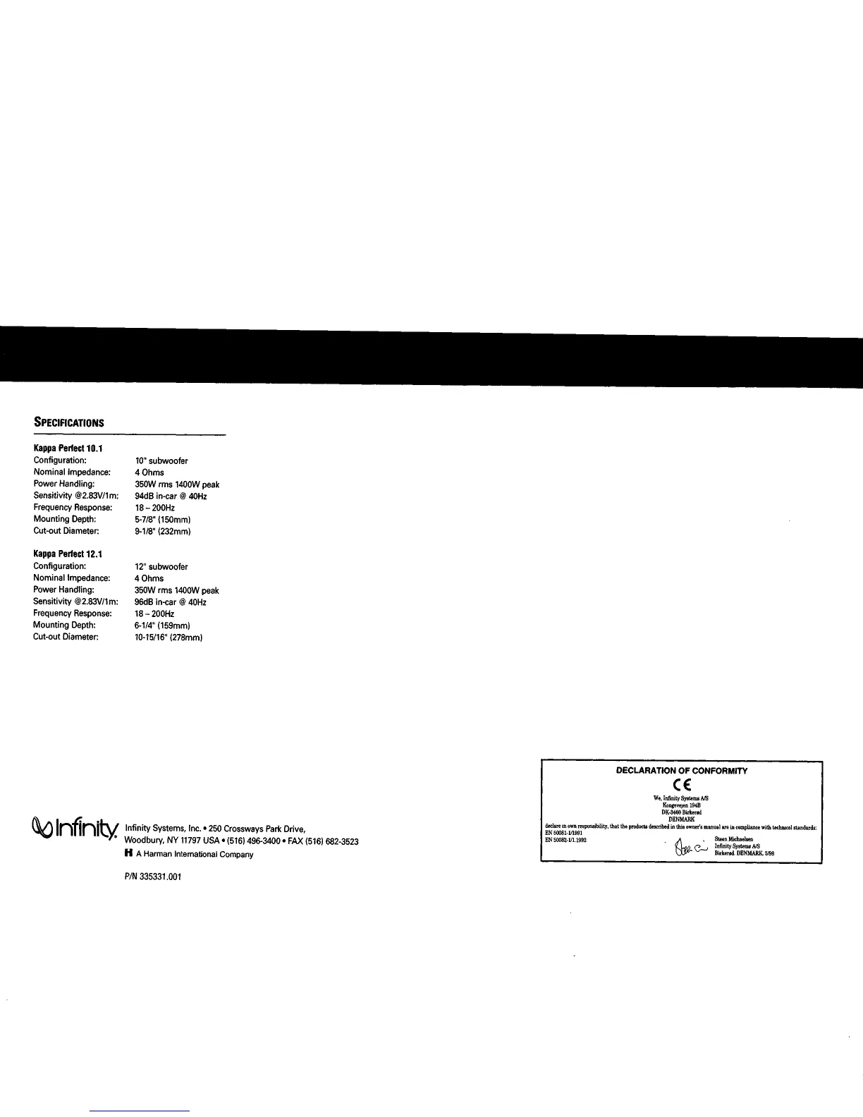 Infinity Kappa Perfect 10.1 - Technical Specifications; Model Specifications; Regulatory Compliance