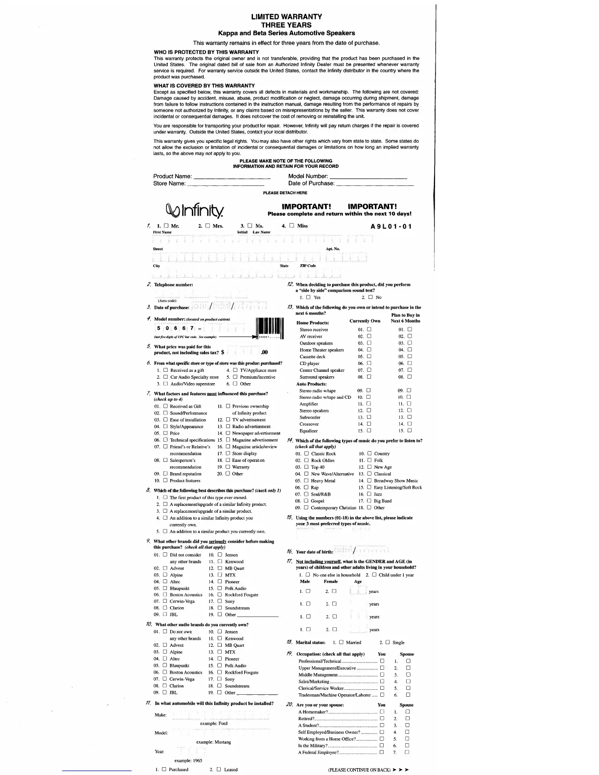 Infinity Kappa Perfect 10.1 - Warranty and Registration; Limited Warranty Information; Customer Registration Form