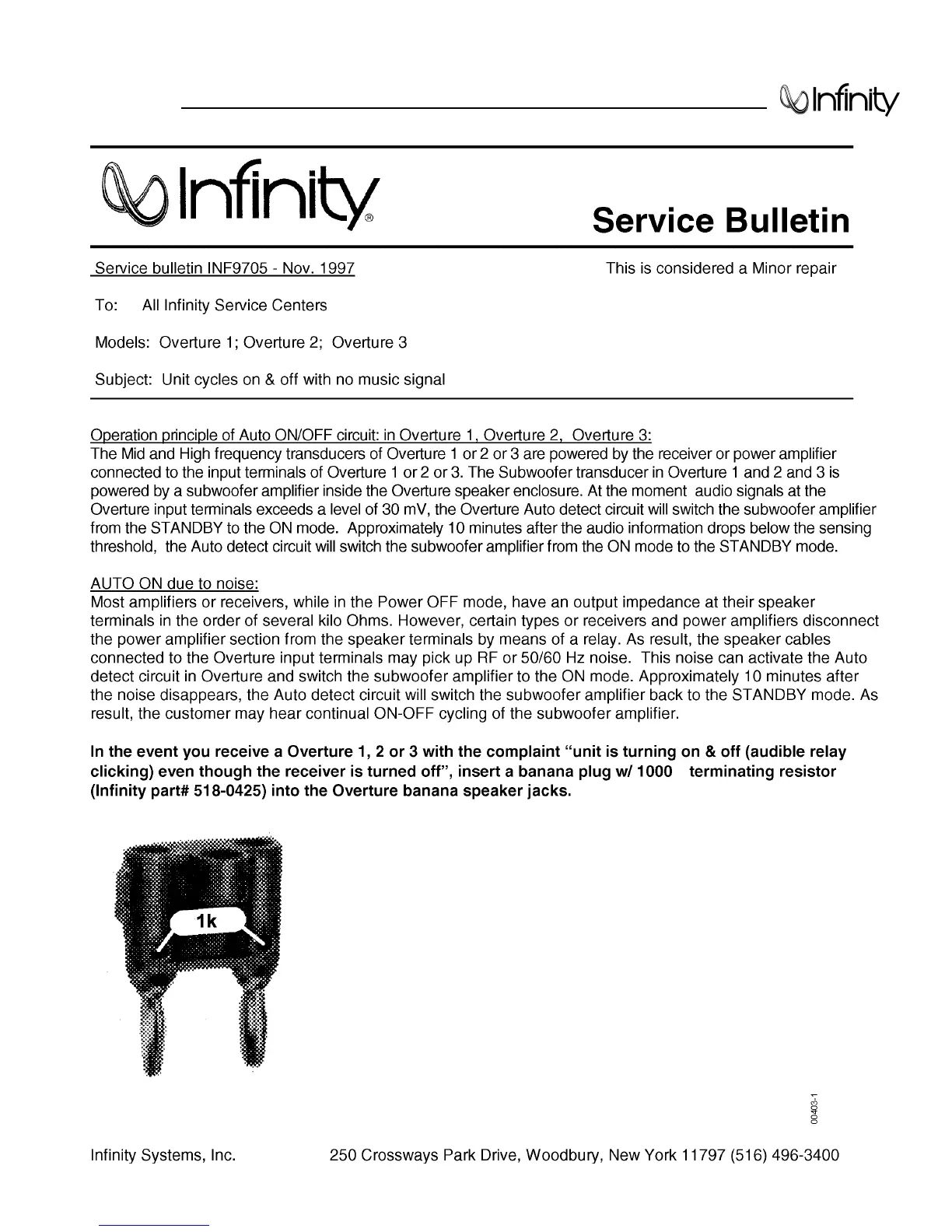 Infinity Overture 1 - Service Bulletin INF9705: Auto Cycling Issue