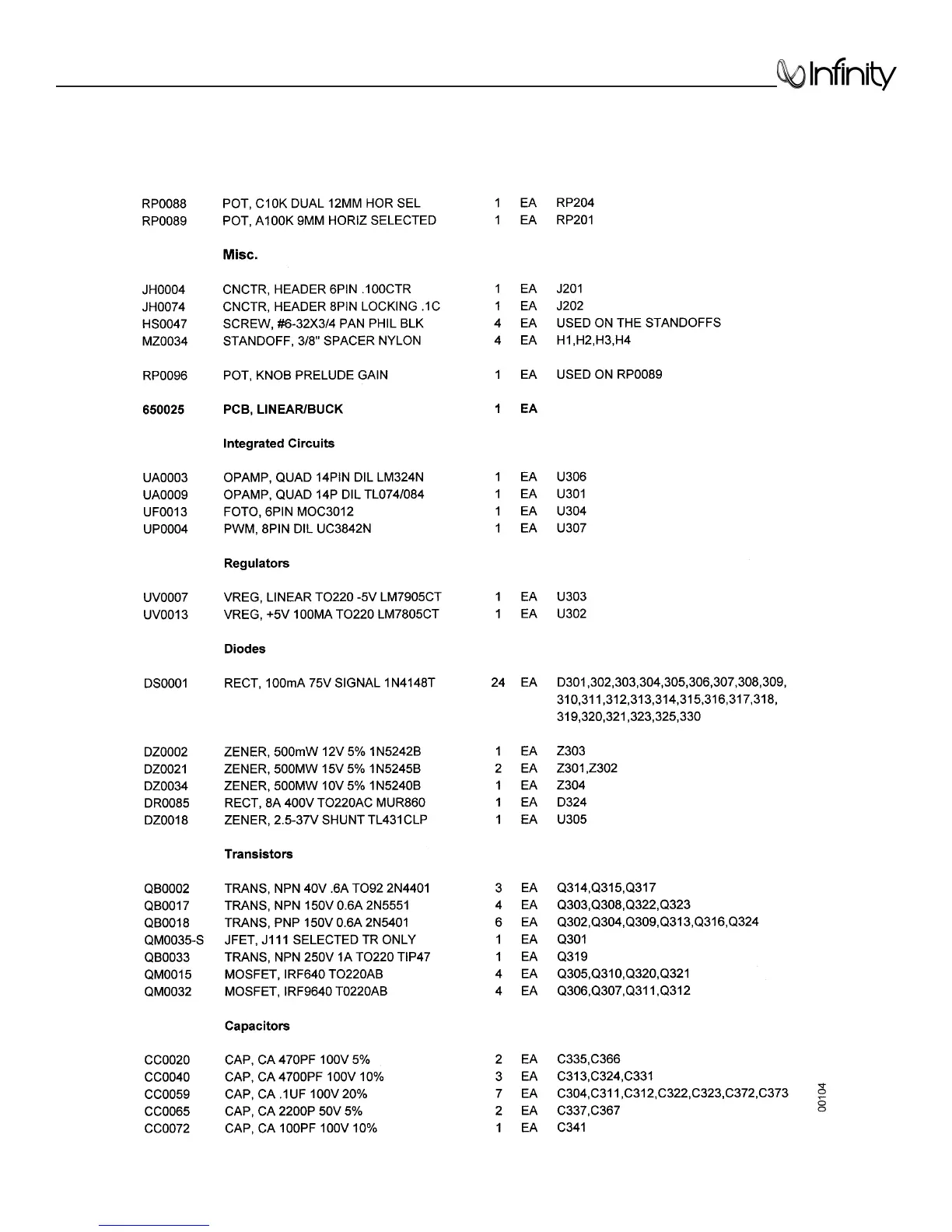 Prelude Amp Assembly Parts List (Cont.)