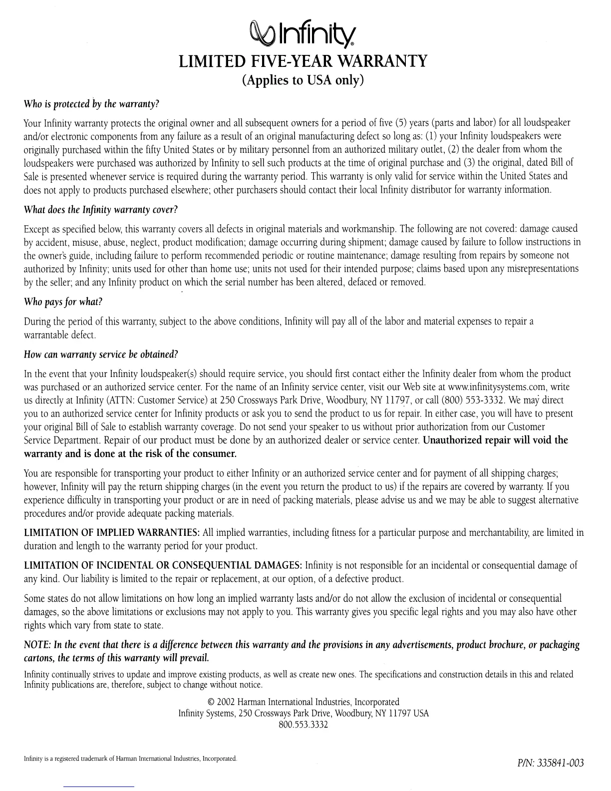 Infinity PRIMUS P143 - Limited Five-Year Warranty