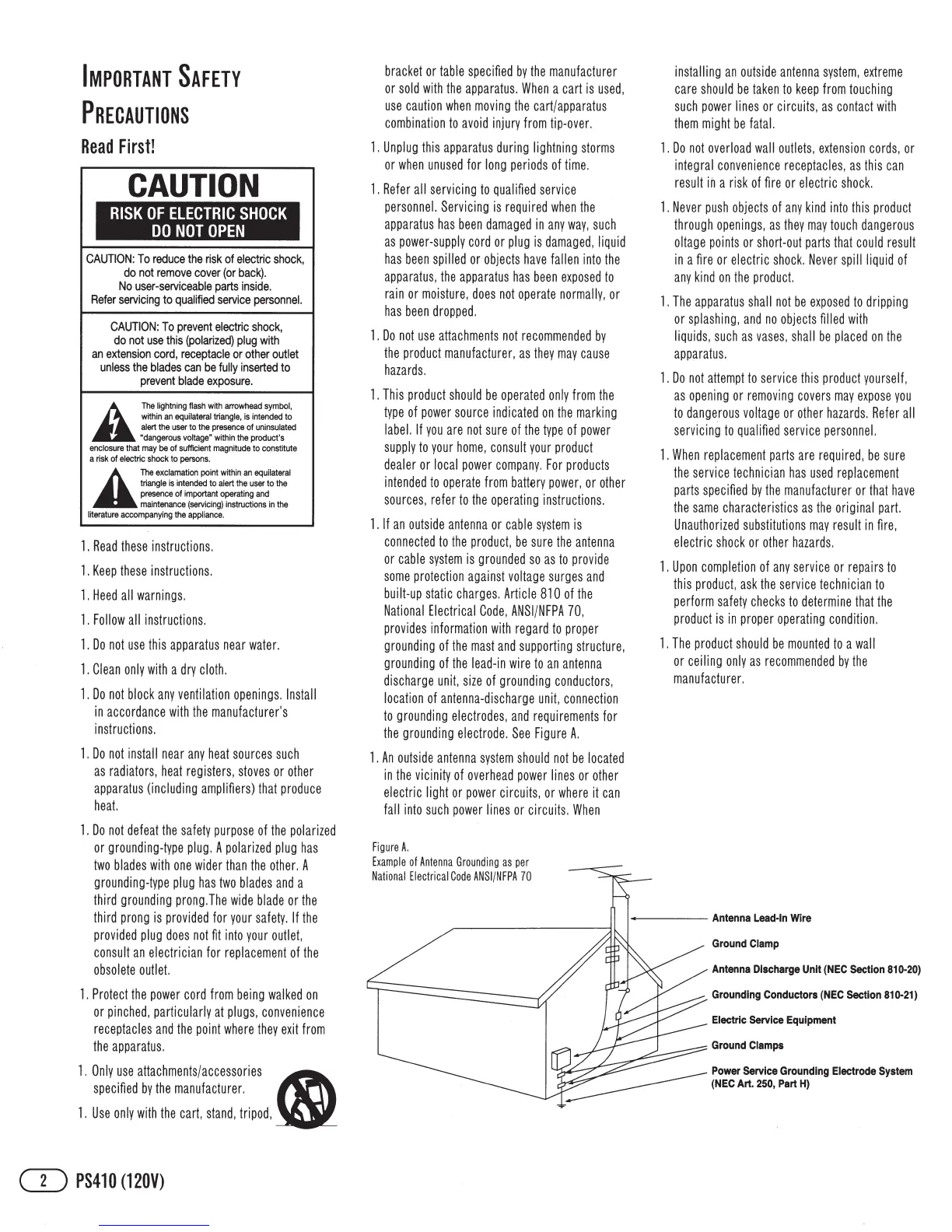 Infinity PS410 - Important Safety PRECAUTIONS; General Safety Instructions; Electrical Safety and Usage Precautions; Antenna Grounding Example