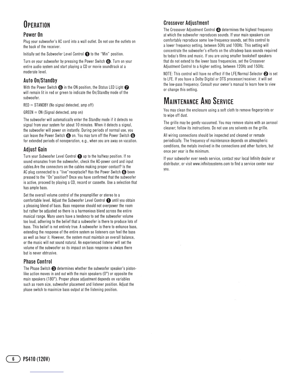 Infinity PS410 - OPERATION; Power On and Auto Standby; Adjusting Subwoofer Settings; MAINTENANCE AND SERVICE
