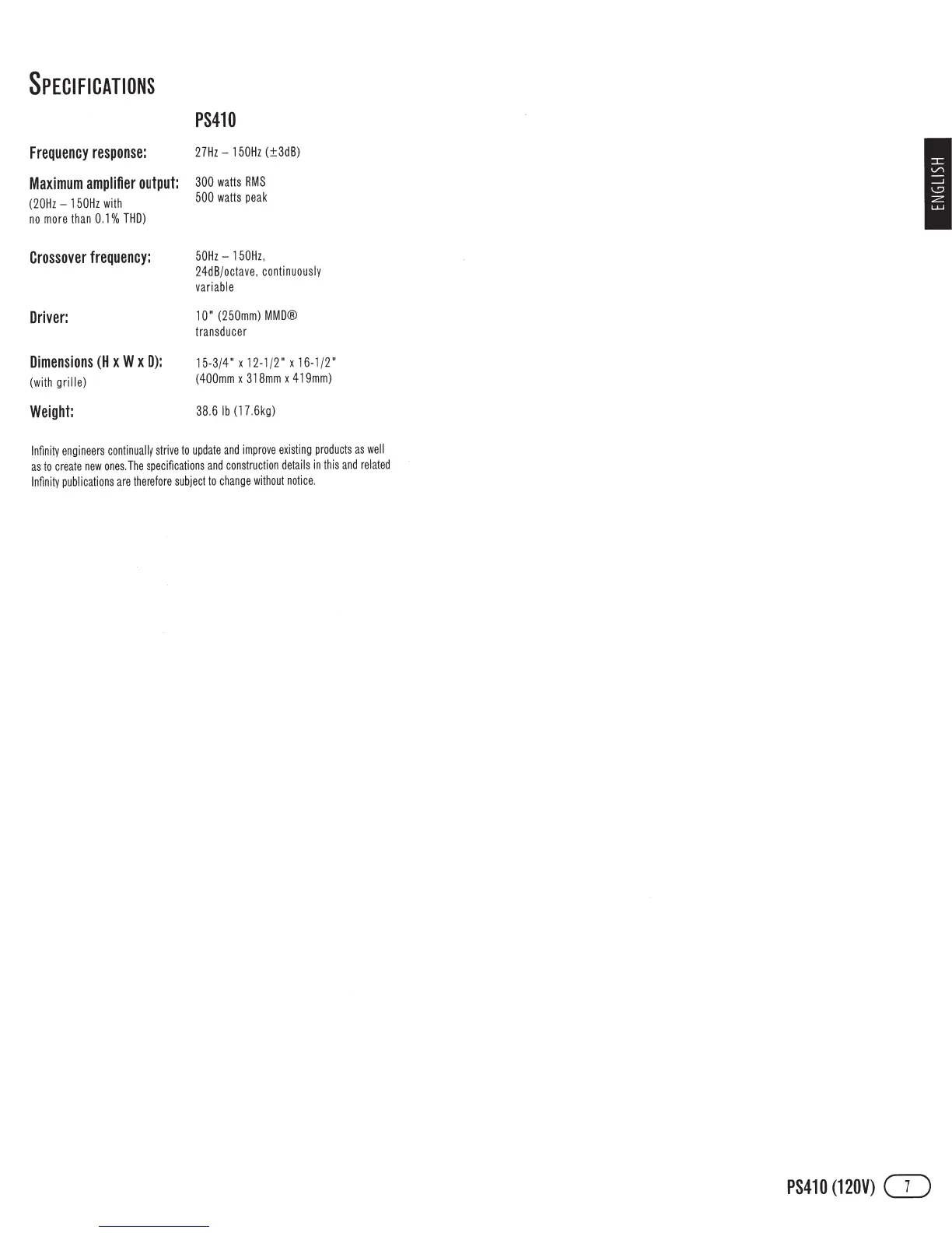 Infinity PS410 - SPECIFICATIONS; Technical Specifications