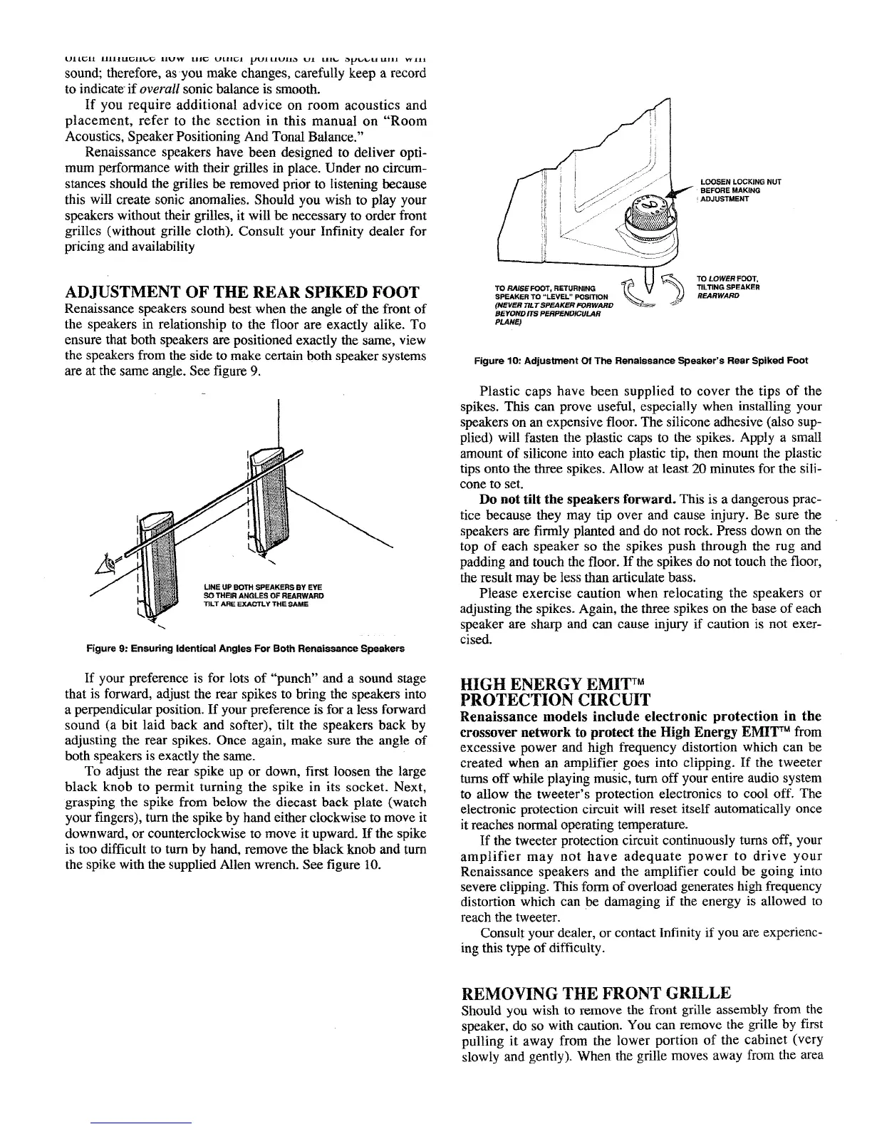 Infinity Renaissance 90 - Adjusting the Rear Spiked Foot; Ensuring Identical Speaker Tilt Angles; Adjusting Spike Height; Spike Tip Protection