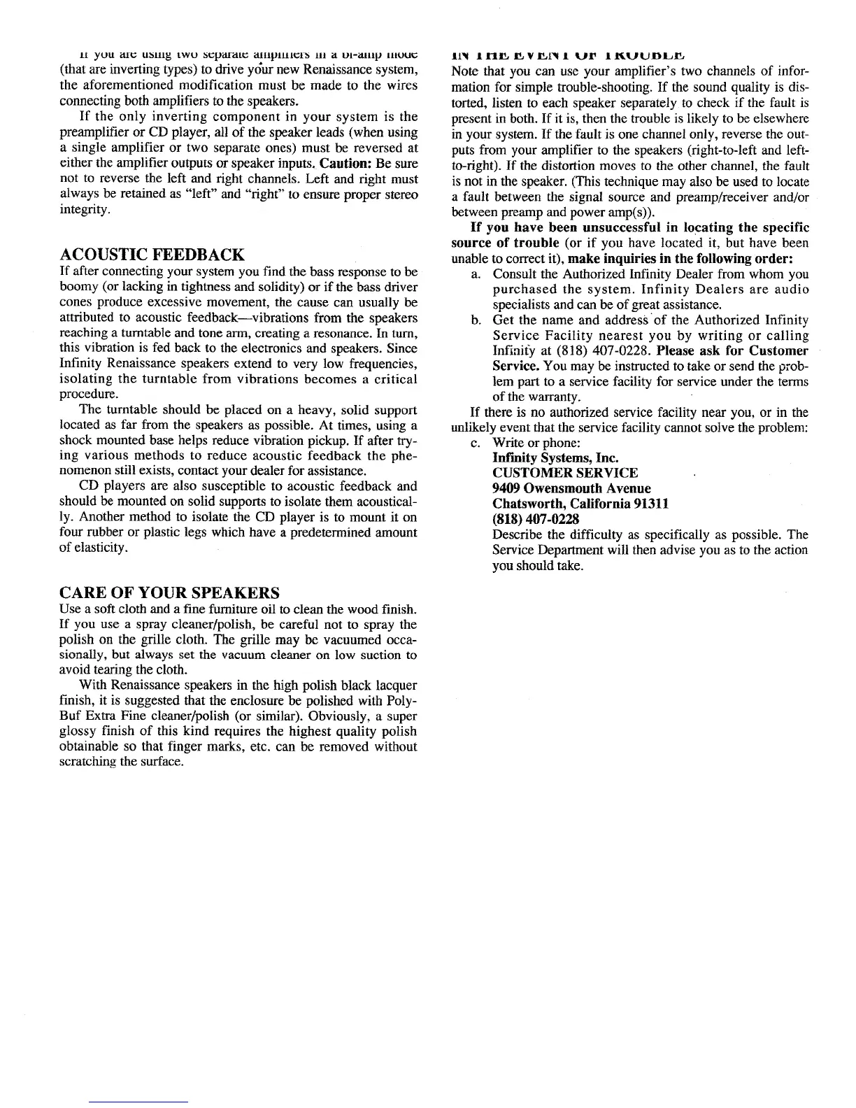 Infinity Renaissance 90 - Acoustic Feedback; Identifying and Reducing Feedback; Care of Your Speakers; Cleaning and Polishing the Finish