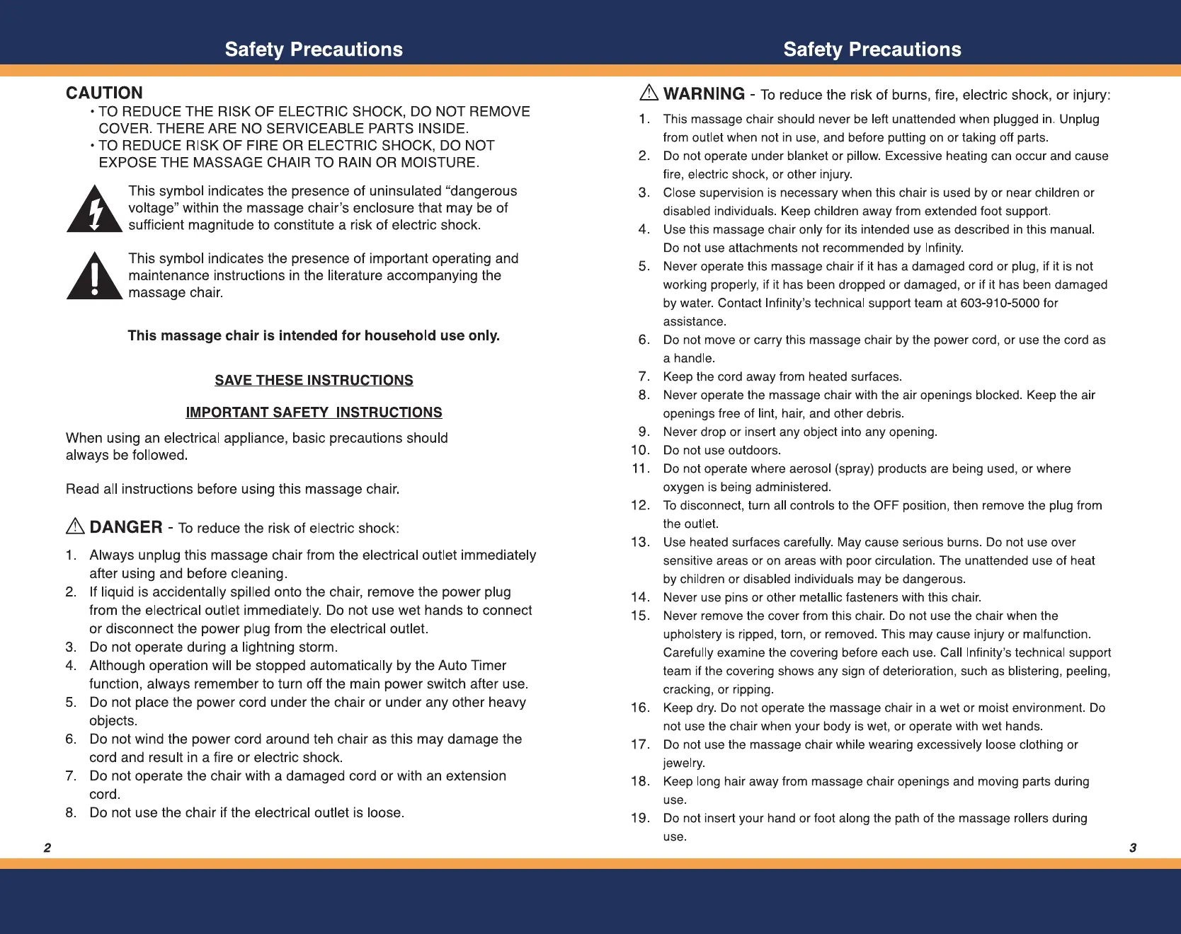 Infinity Riage CS - Safety Precautions; General Warnings; Electric Shock Prevention; Fire and Burn Prevention