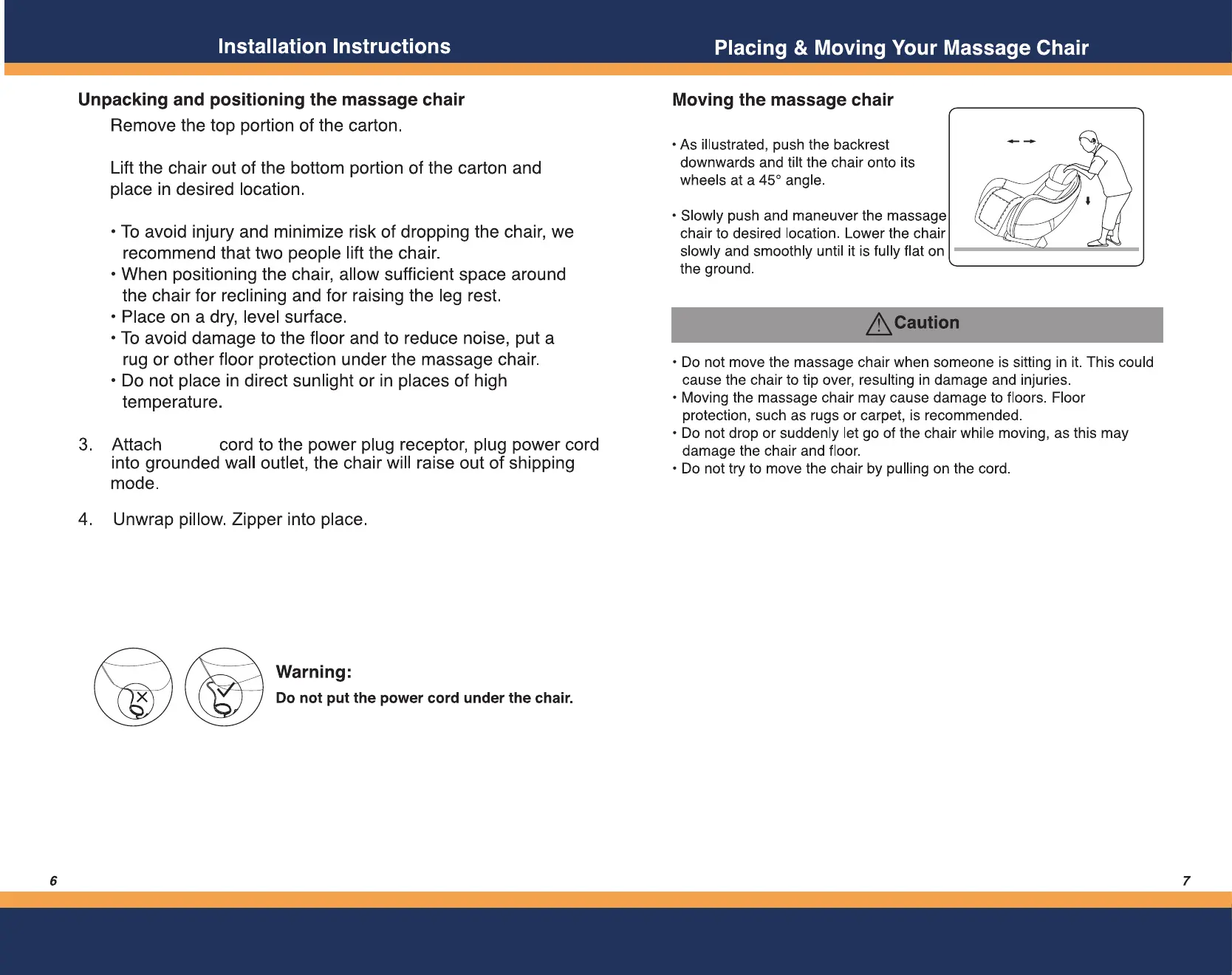 Infinity Riage CS - Installation and Setup; Unpacking and Positioning; Moving the Massage Chair; Safe Moving Procedures