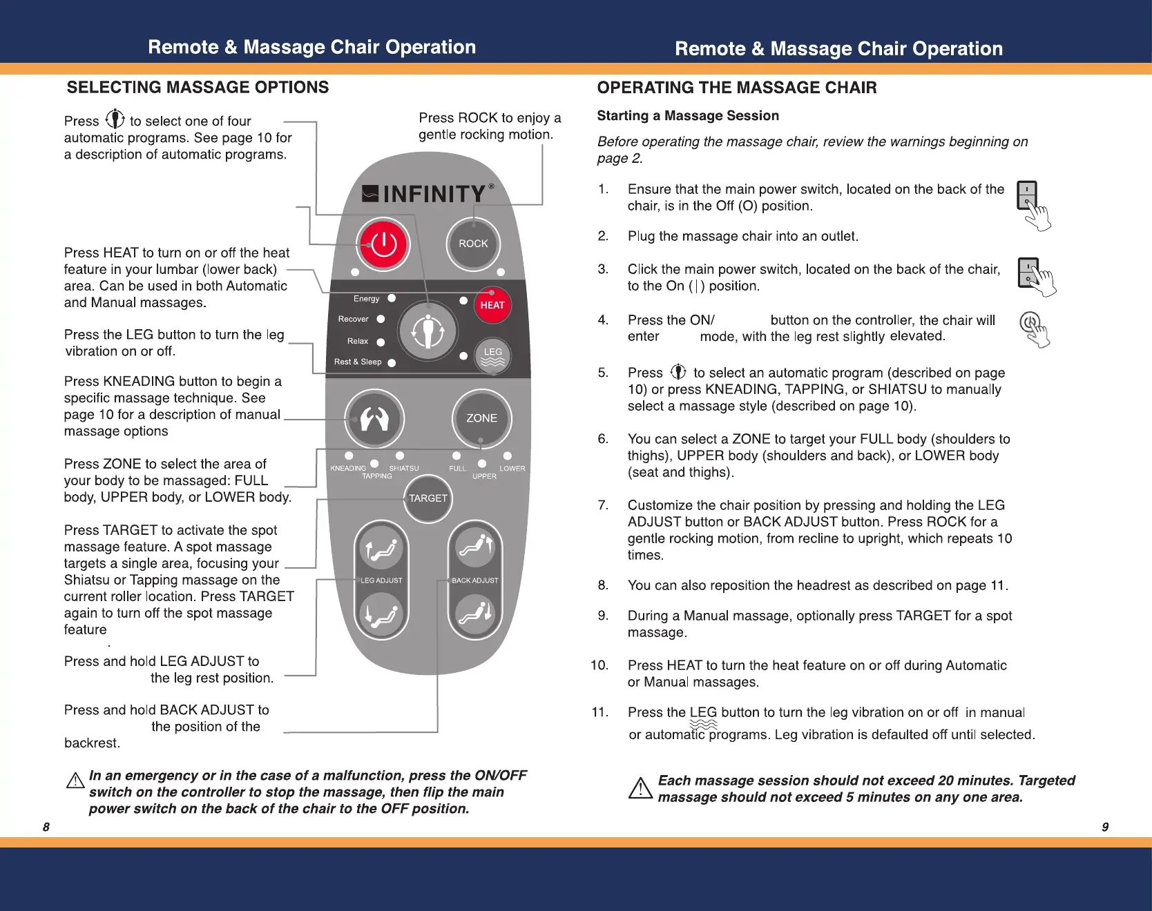 Infinity Riage CS - Remote and Chair Operation; Selecting Massage Options; Starting a Massage Session