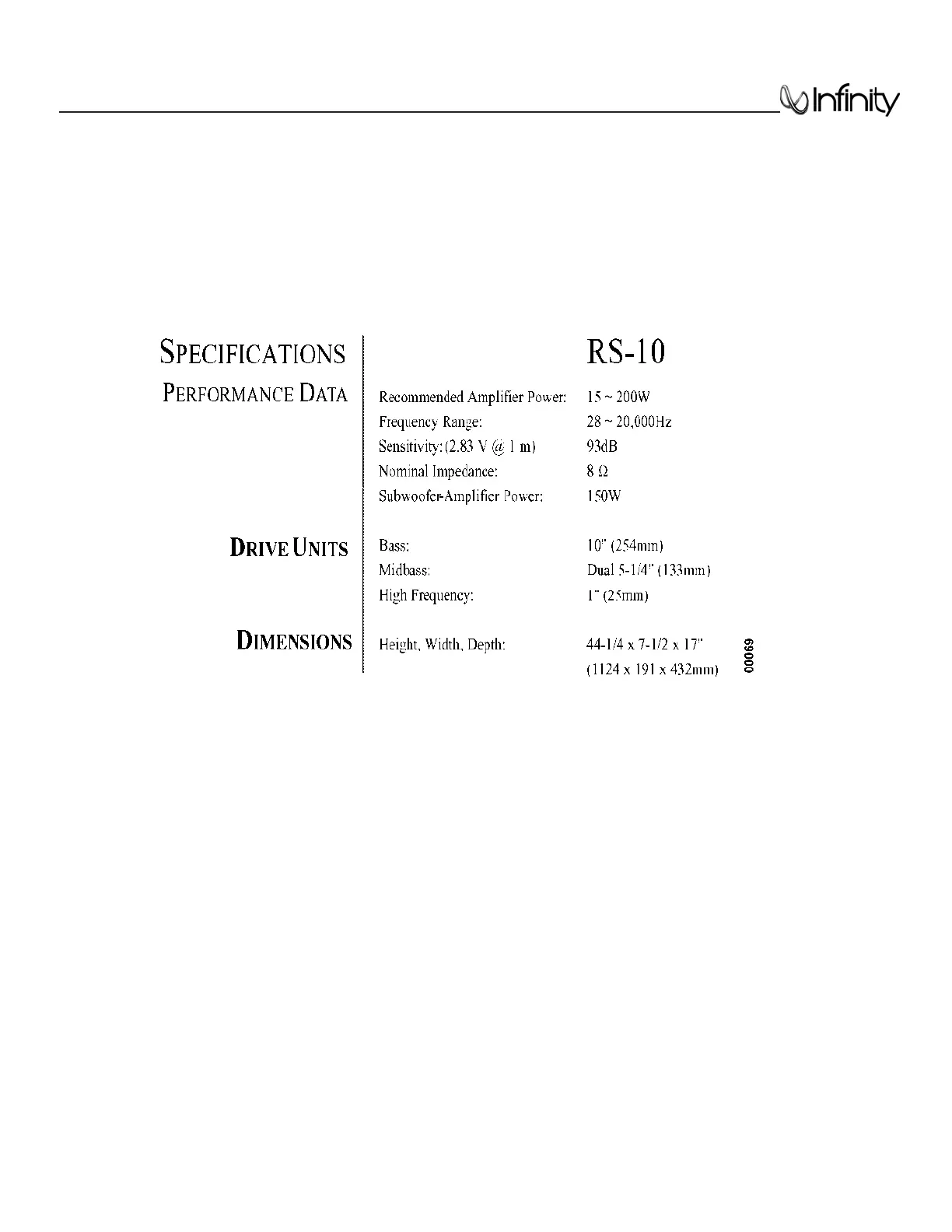 Infinity RS-10 - Specifications; Performance Data; Drive Units; Dimensions