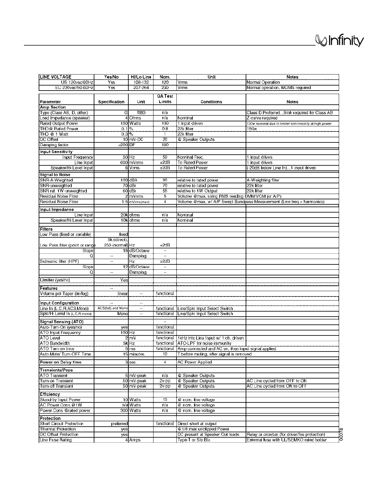 Infinity RS-10 - Amplifier Specifications; Line Voltage and Amplifier Parameters; Input Sensitivity and Impedance; Filters and Features