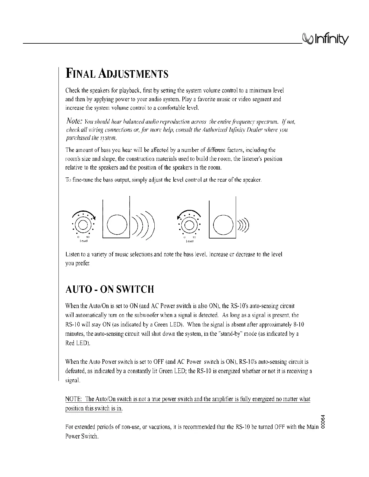 Infinity RS-10 - Final Adjustments and Auto-On Operation; System Tuning and Bass Level Adjustment; Auto-On Switch Functionality