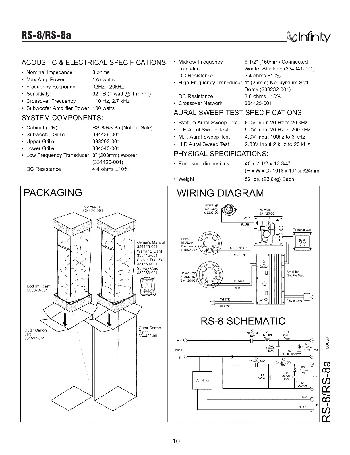Infinity RS-8 - System Components; Aural Sweep Test Specifications; Wiring Diagram; Passive Schematic Diagram