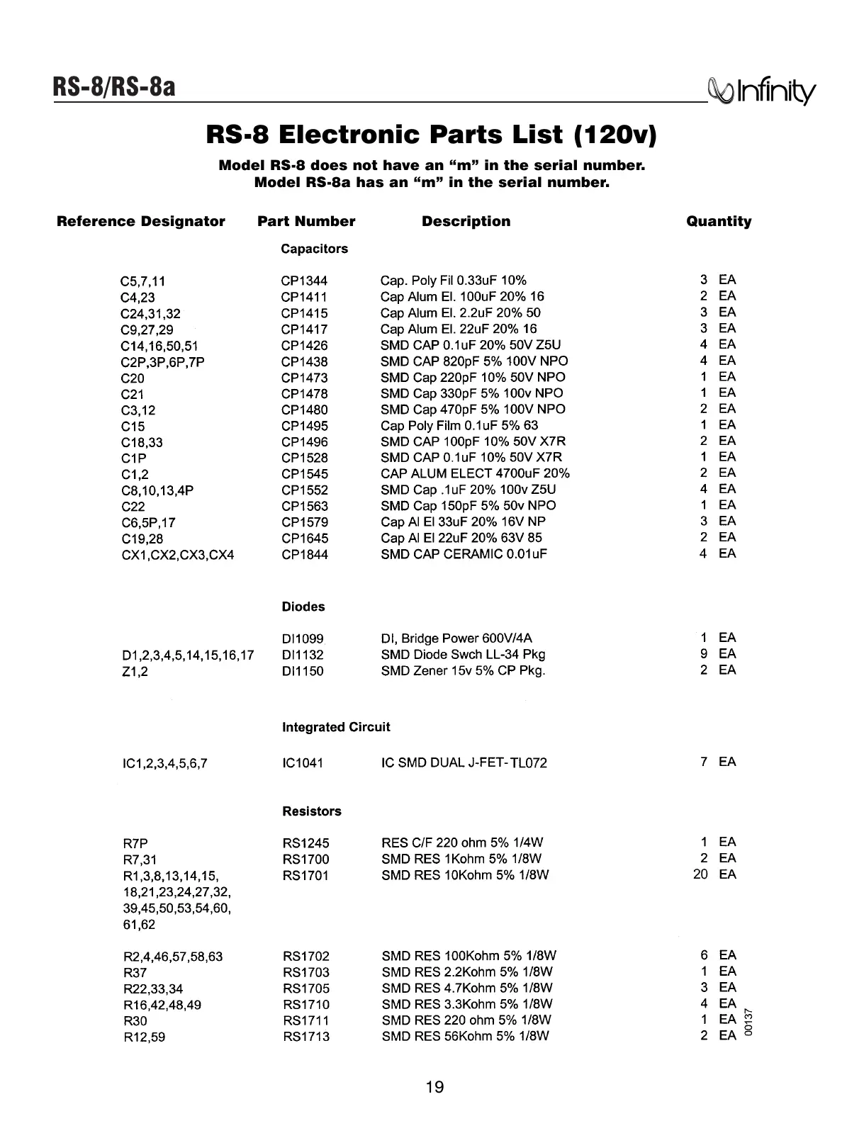 Infinity RS-8 - Rs8 Electrical Parts List (120 V)