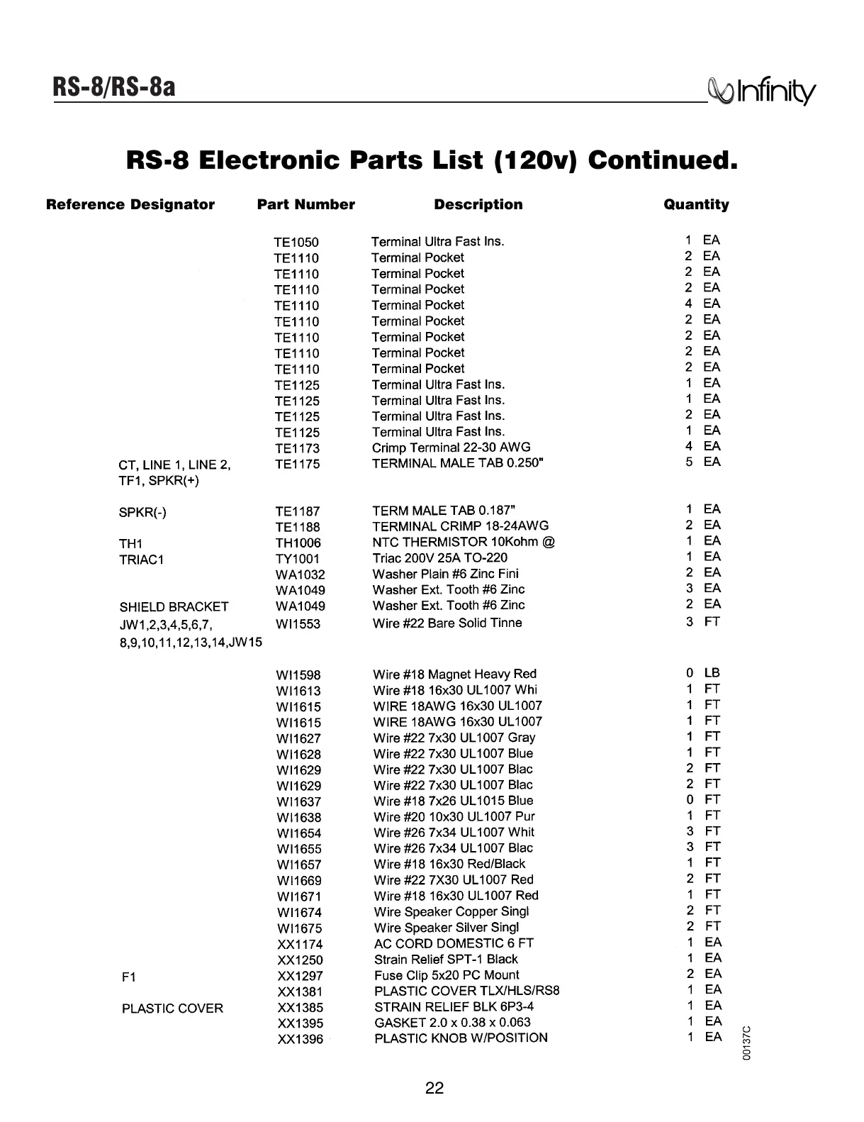 Infinity RS-8 - Rs8 A ELECTRICAL PARTS LIST