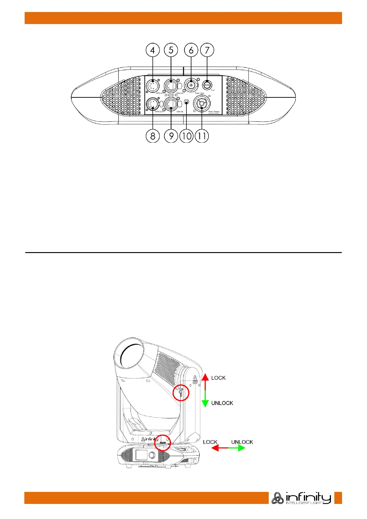 (vertically) for Tilt (Red arrows). You can unlock the moving head by sliding the lock pin to the right