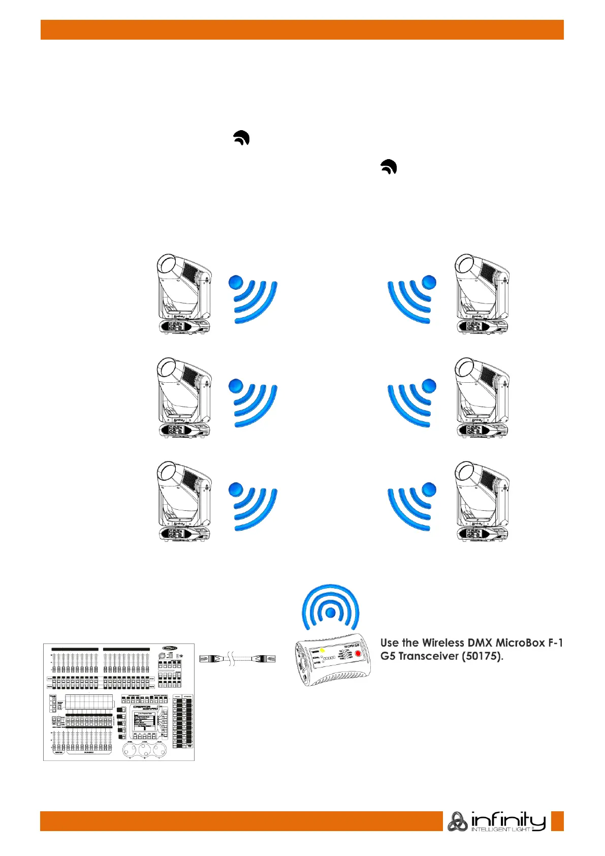 02) In order for the Infinitys to receive a wireless DMX signal properly, activate W-DMX on all Infinitys (see