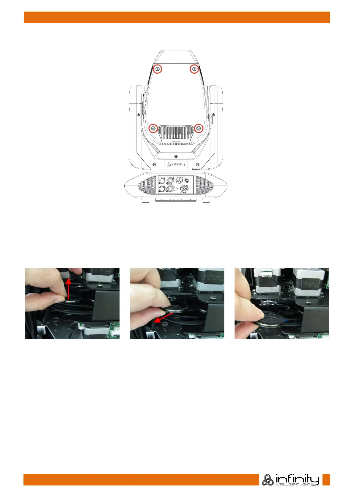 01) Before removing the top part of the housing, make sure that the moving head is in the horizontal