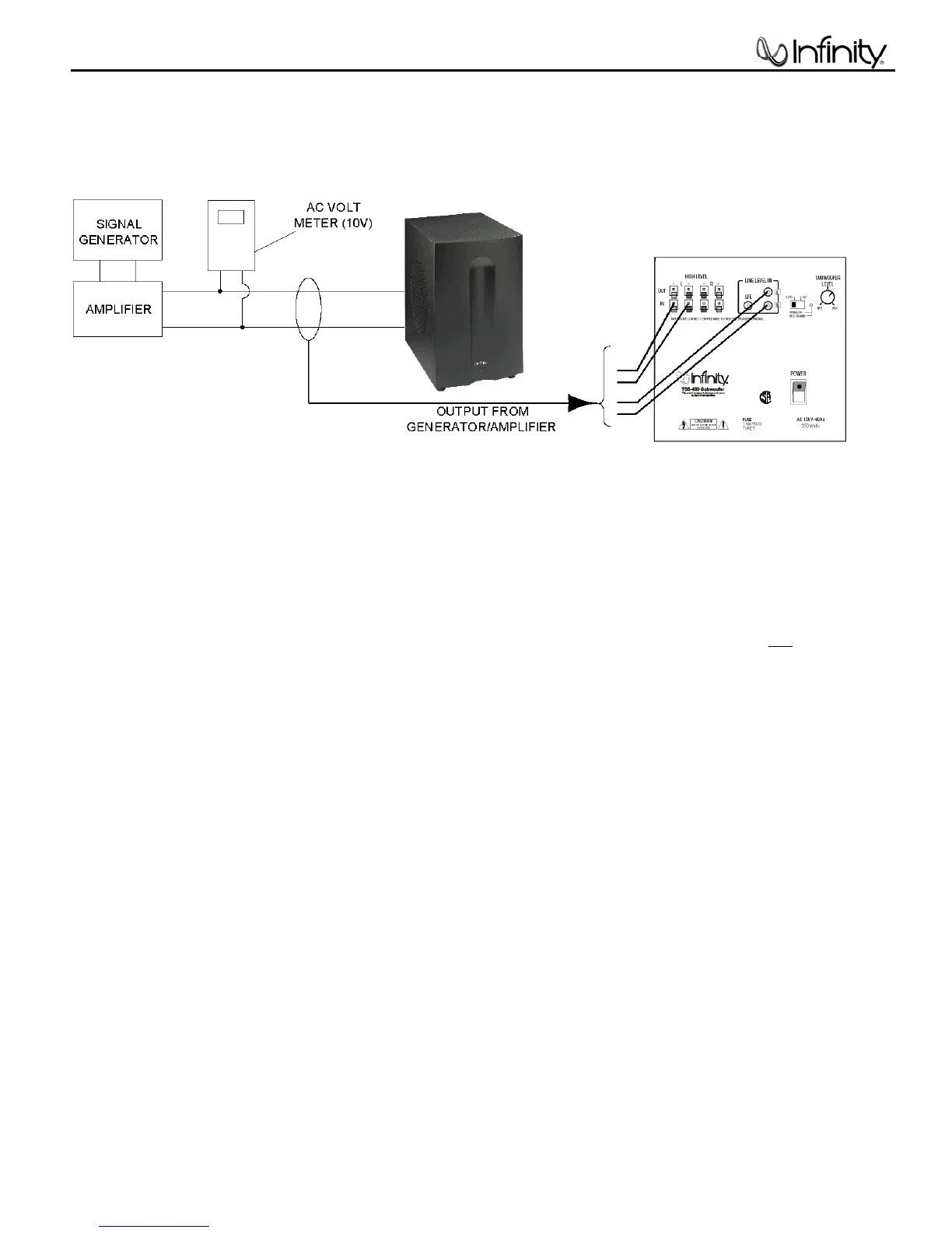 fed by a signal generator. Turn on generator and adjust so that speaker level output is 5.0V.