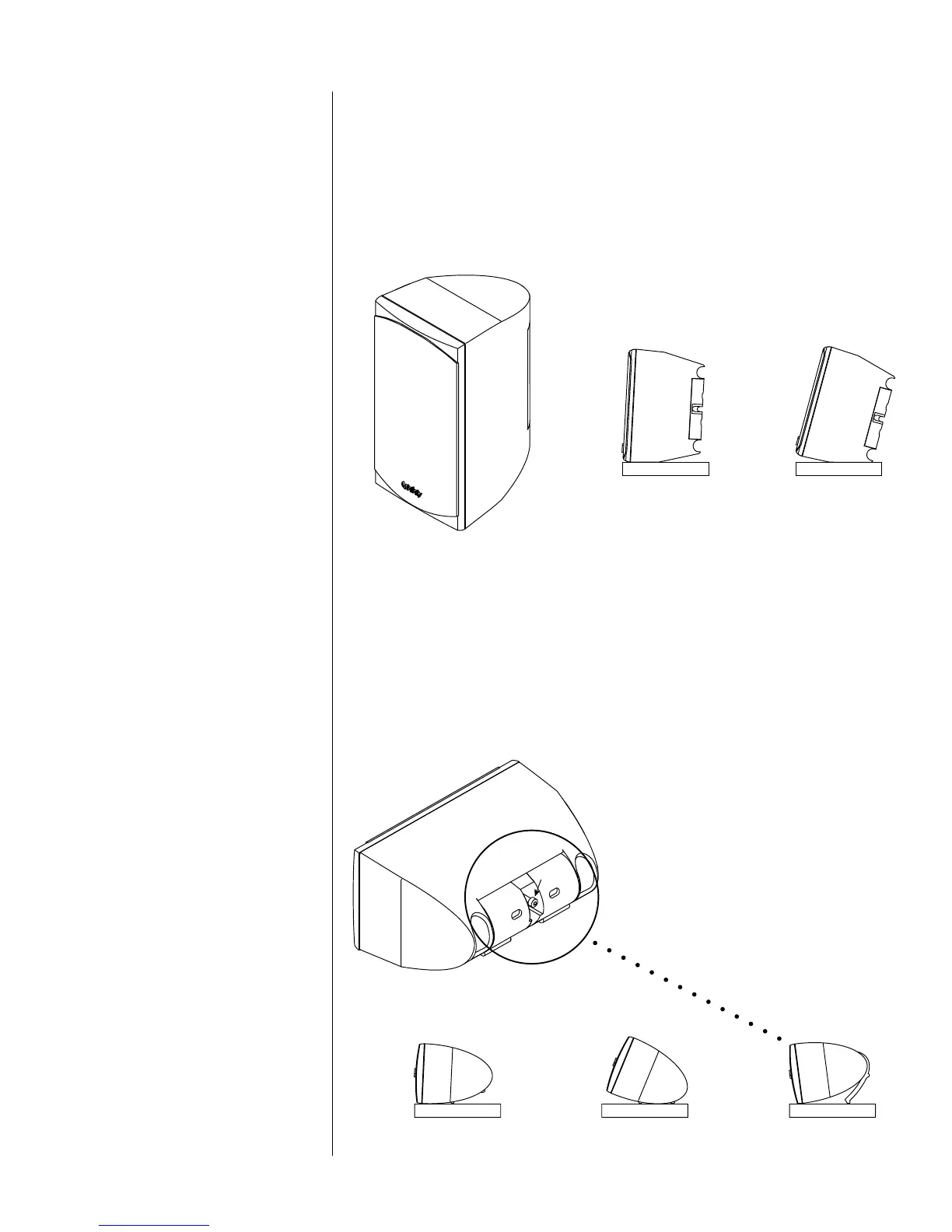 US-1 speakers can be positioned horizontally in three positions on a shelf or stand, as shown