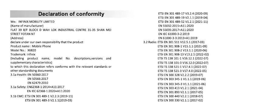 Infinix ZERO ULTRA - Declaration of Conformity; Health and Safety Standards Compliance; EMC and Radio Standards Compliance