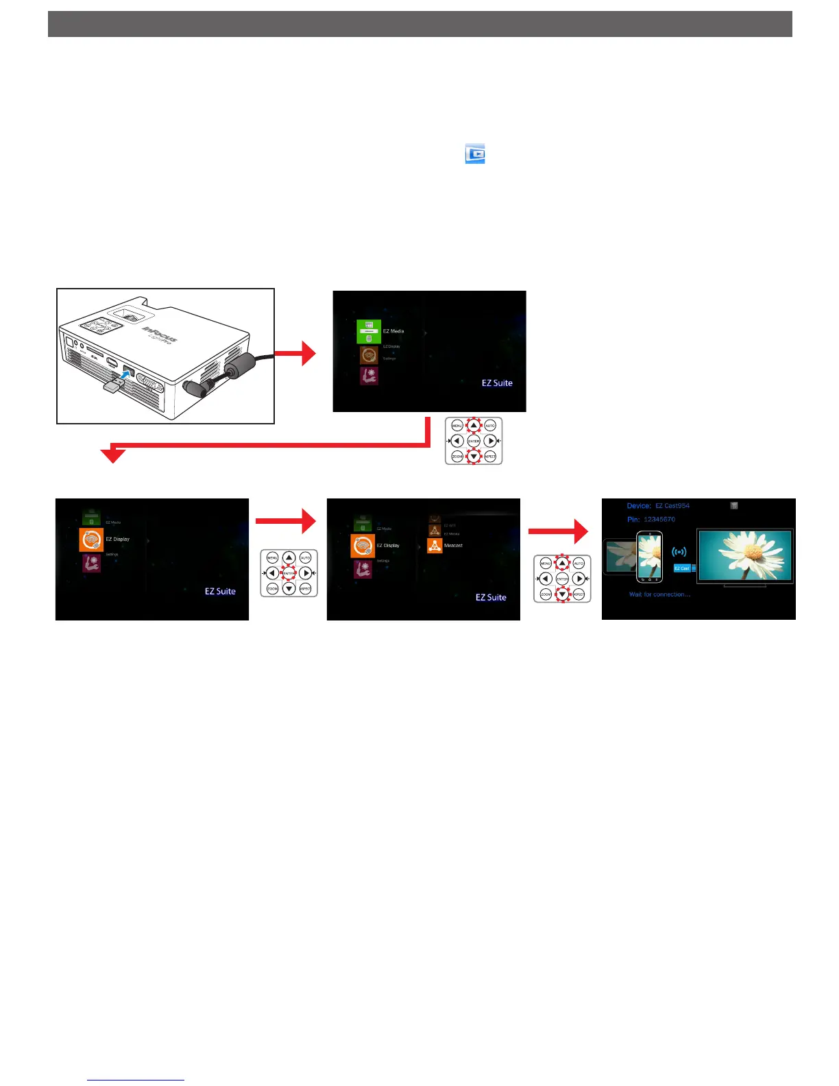 4. Enter Miracast in the projector's menu and wait until the connection to the portable device is established. (Home Menu > [EZ Display > [Miracast]).