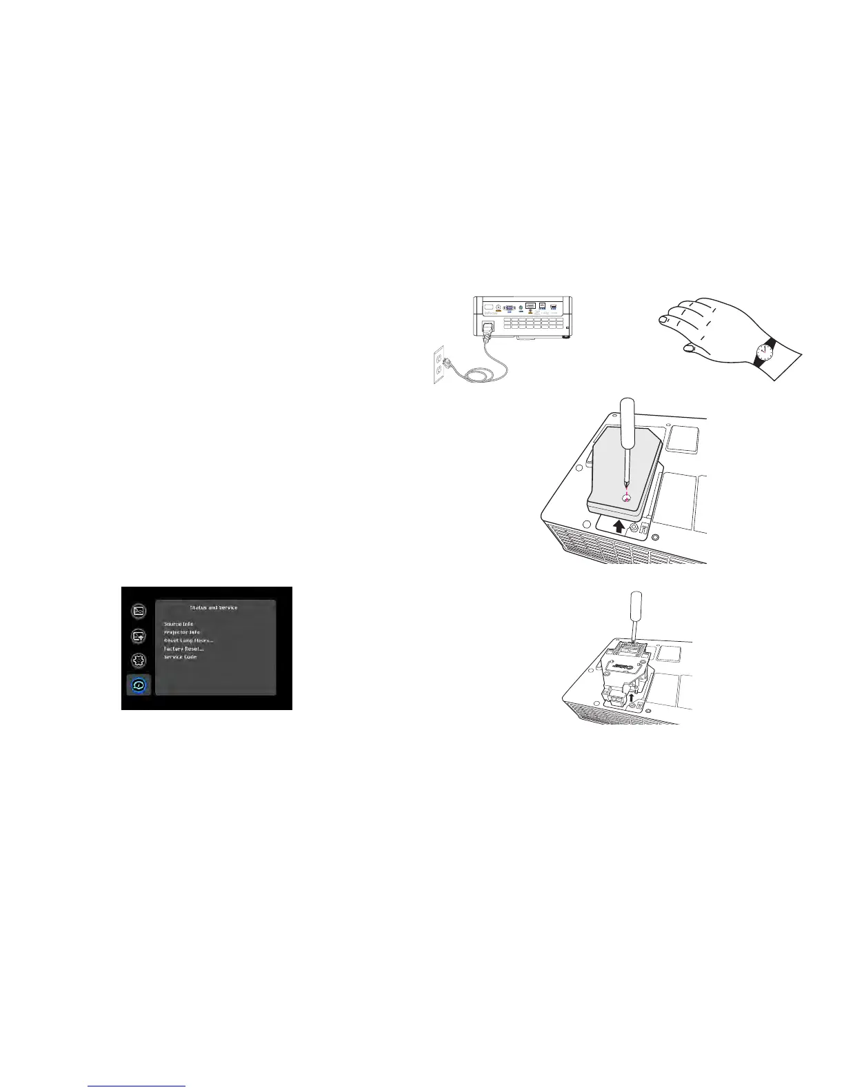 9 To reset the lamp hour timer, navigate to the Status and Service menu and