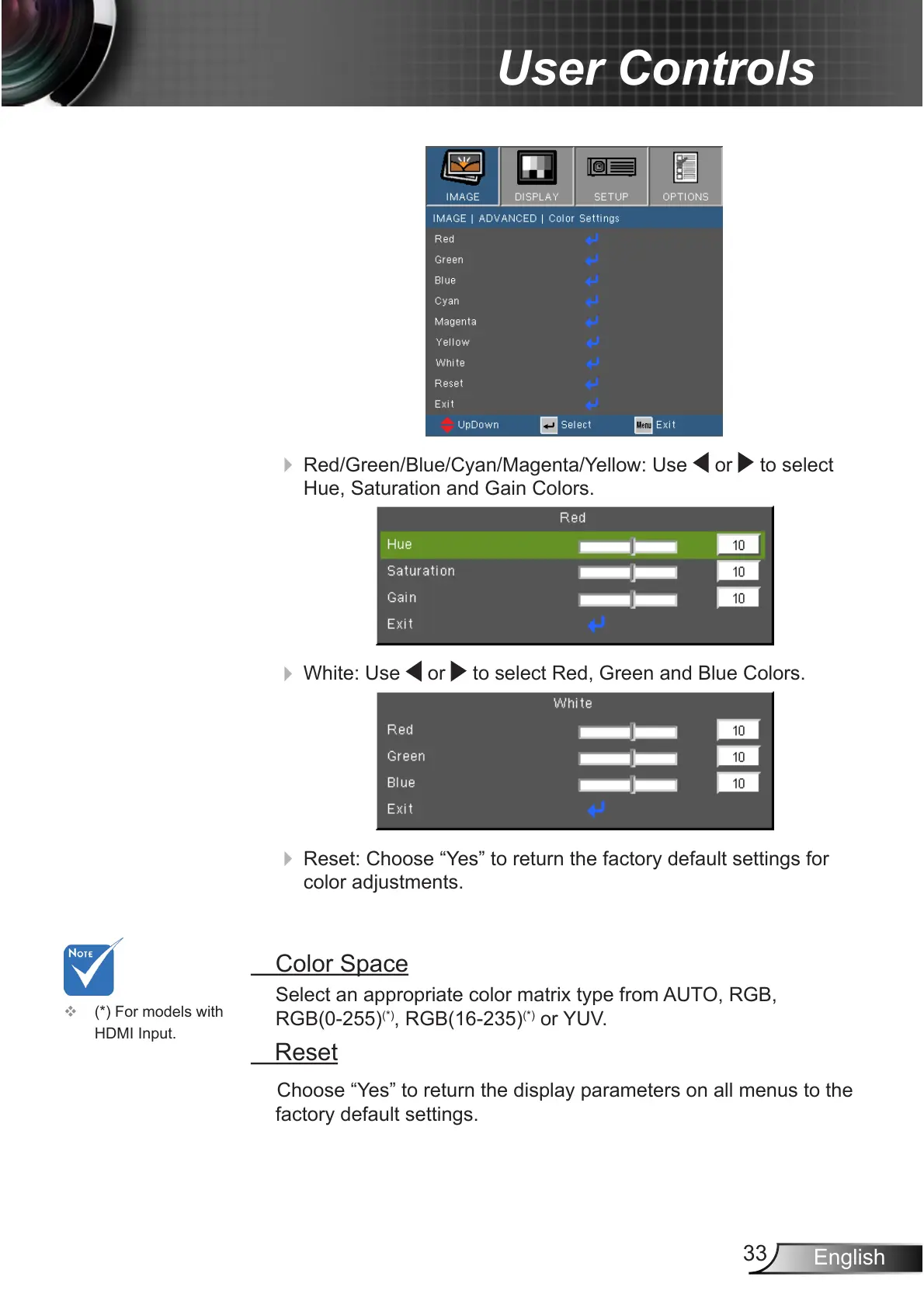 Hue, Saturation and Gain Colors.