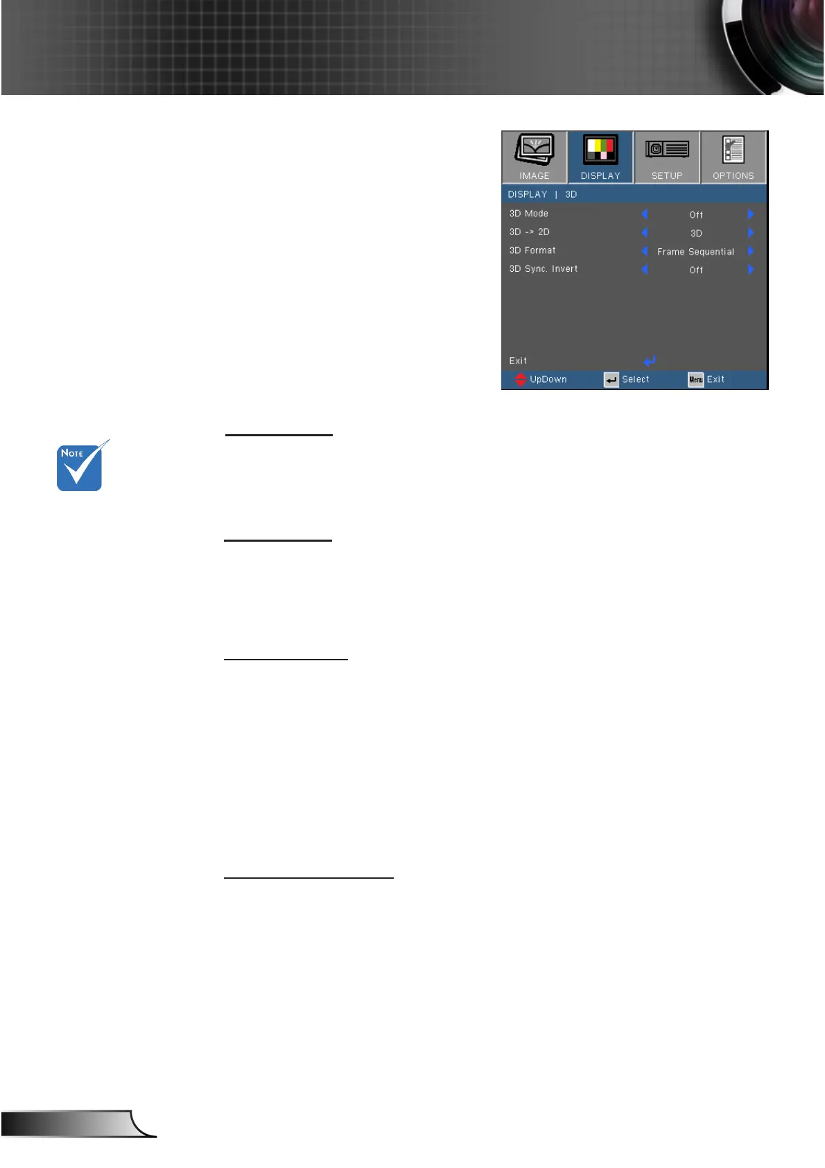 Off: Select “Off” to turn 3D settings off for 3D images.