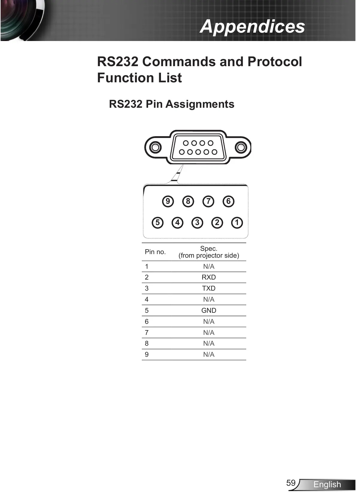 InFocus IN224 - RS232 Commands and Protocol Function List; RS232 Pin Assignments