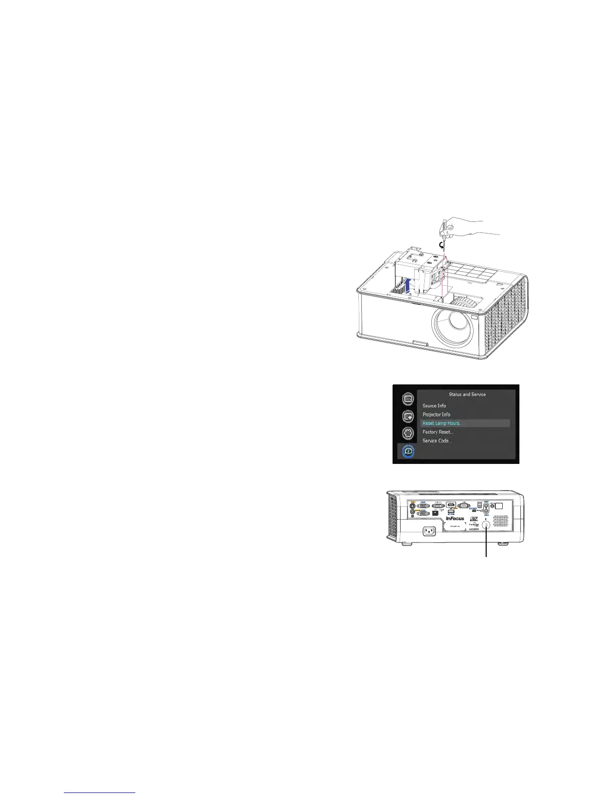 10 To reset the lamp hour timer, navigate to the Status and Service menu and