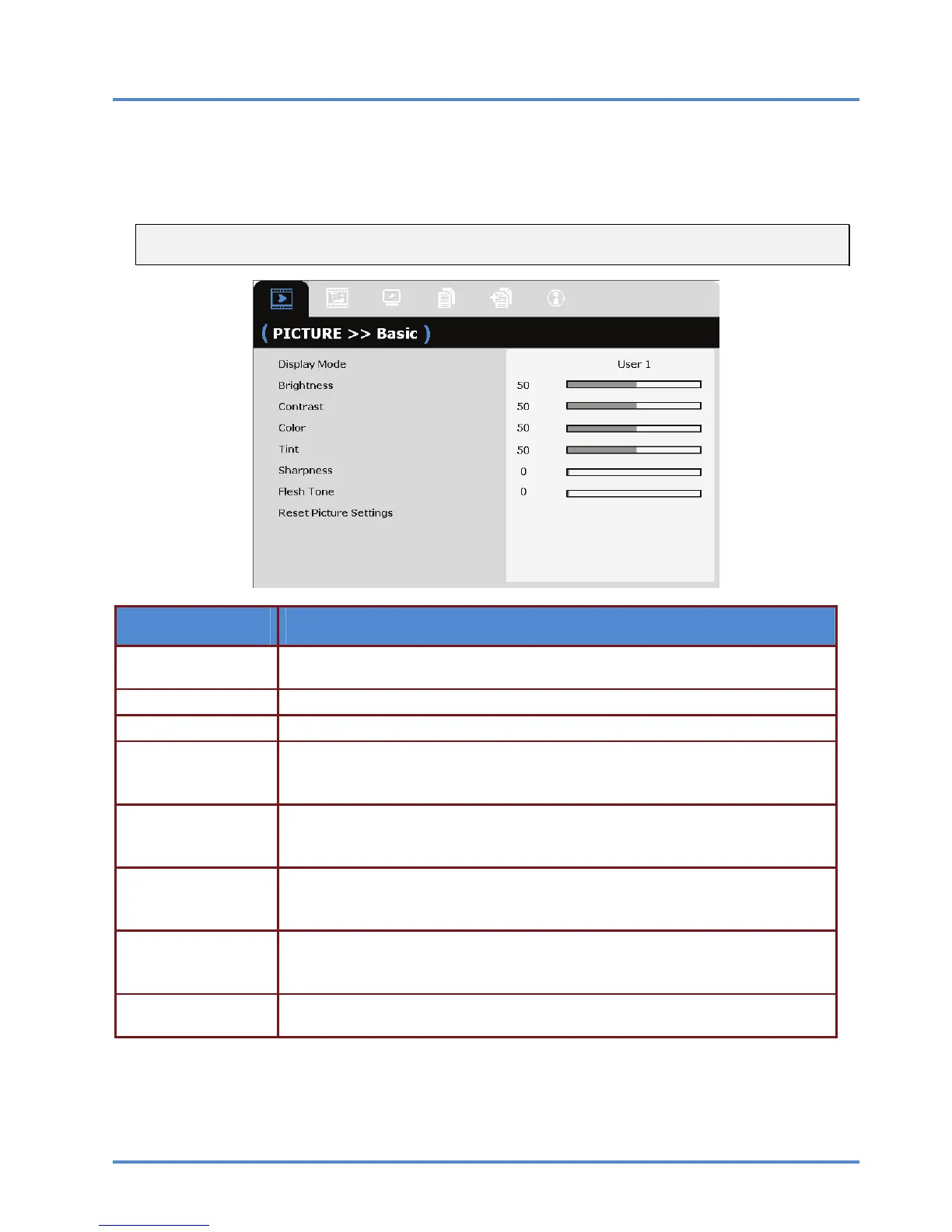 Customizing the settings in PICTURE>>Basic menu is only available in User 1/ 2/ 3 mode.
