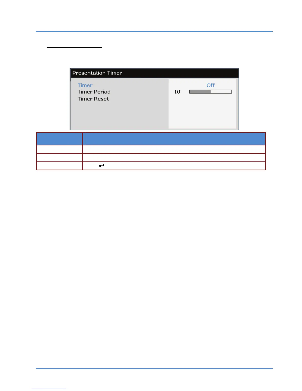 Timer Press the cursor ◄► button to enable or disable presentation timer.
