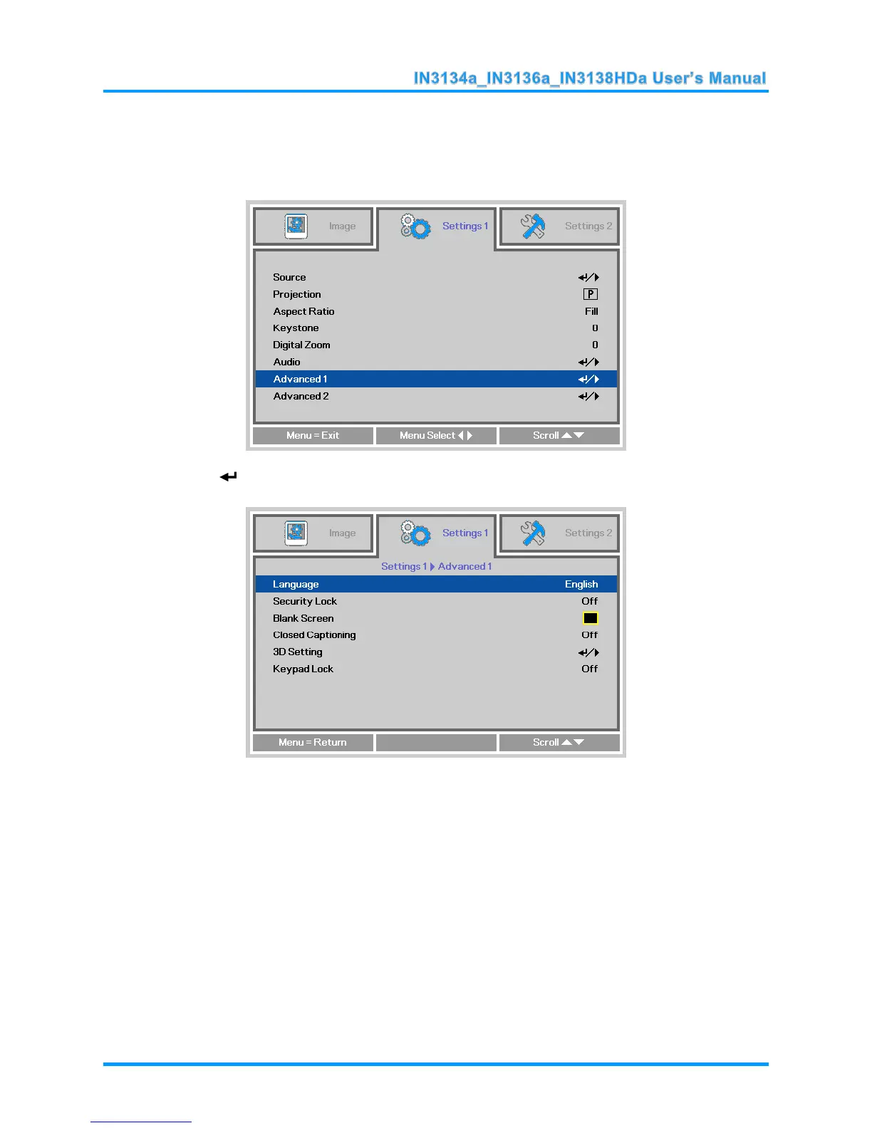 2. Press (Enter) or to enter the Advanced 1 sub menu. Press the ▲▼ buttons until