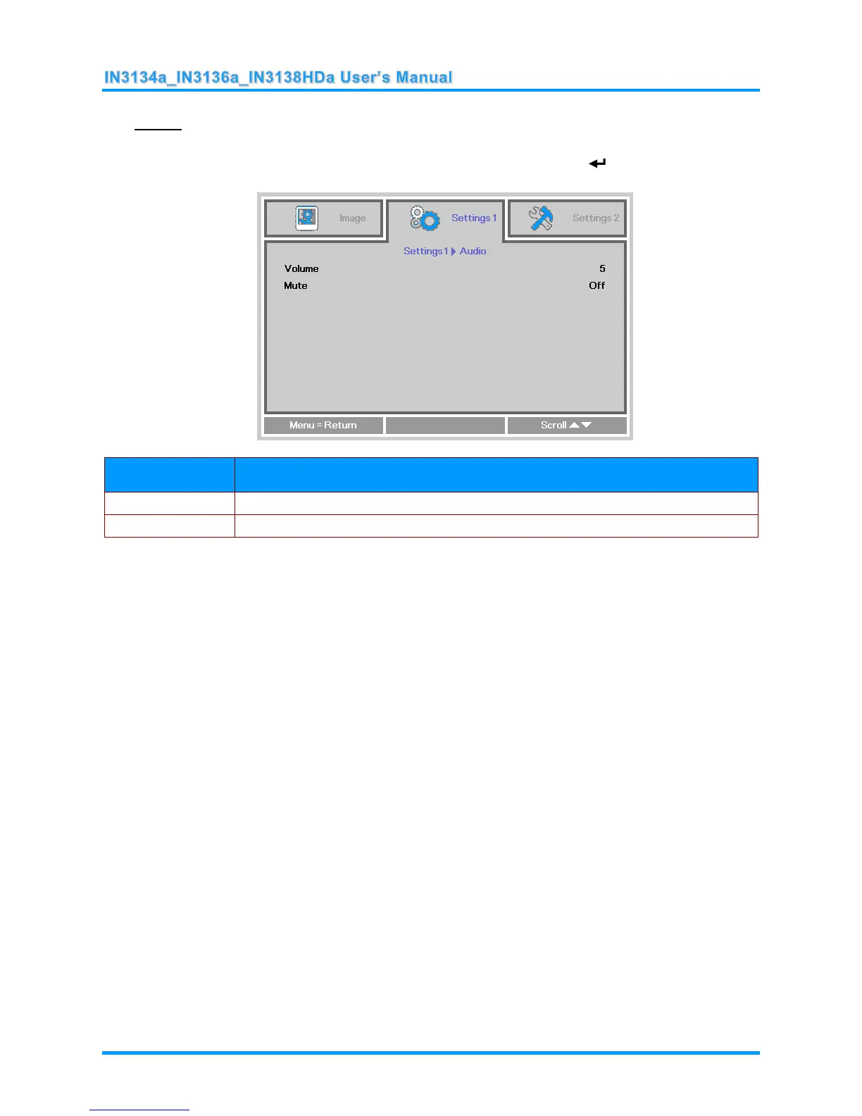 Press the Menu button to open the OSD menu. Press the ◄► buttons to move to the Settings 1