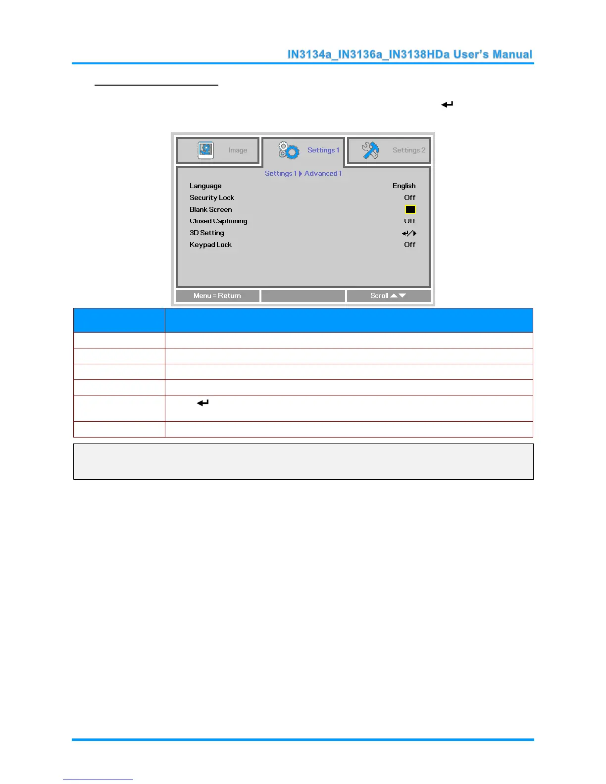 Press the Menu button to open the OSD menu. Press the ◄► buttons to move to the Settings 1