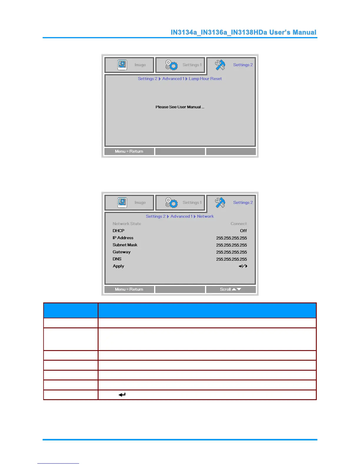 InFocus IN3134a - Lamp Hour Reset and Network Configuration; Lamp Hour Reset; Network Configuration