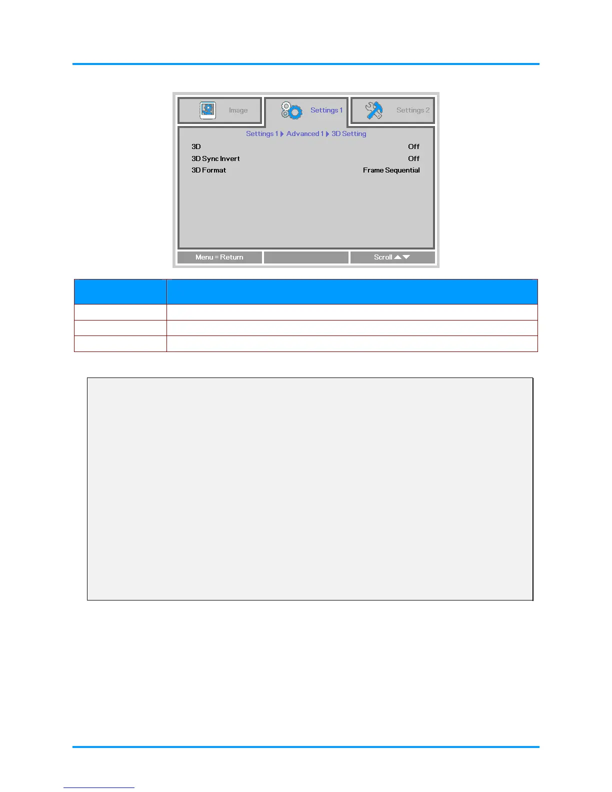 2. When the projector is connected to an appropriate 3D source, the 3D OSD menu items are available