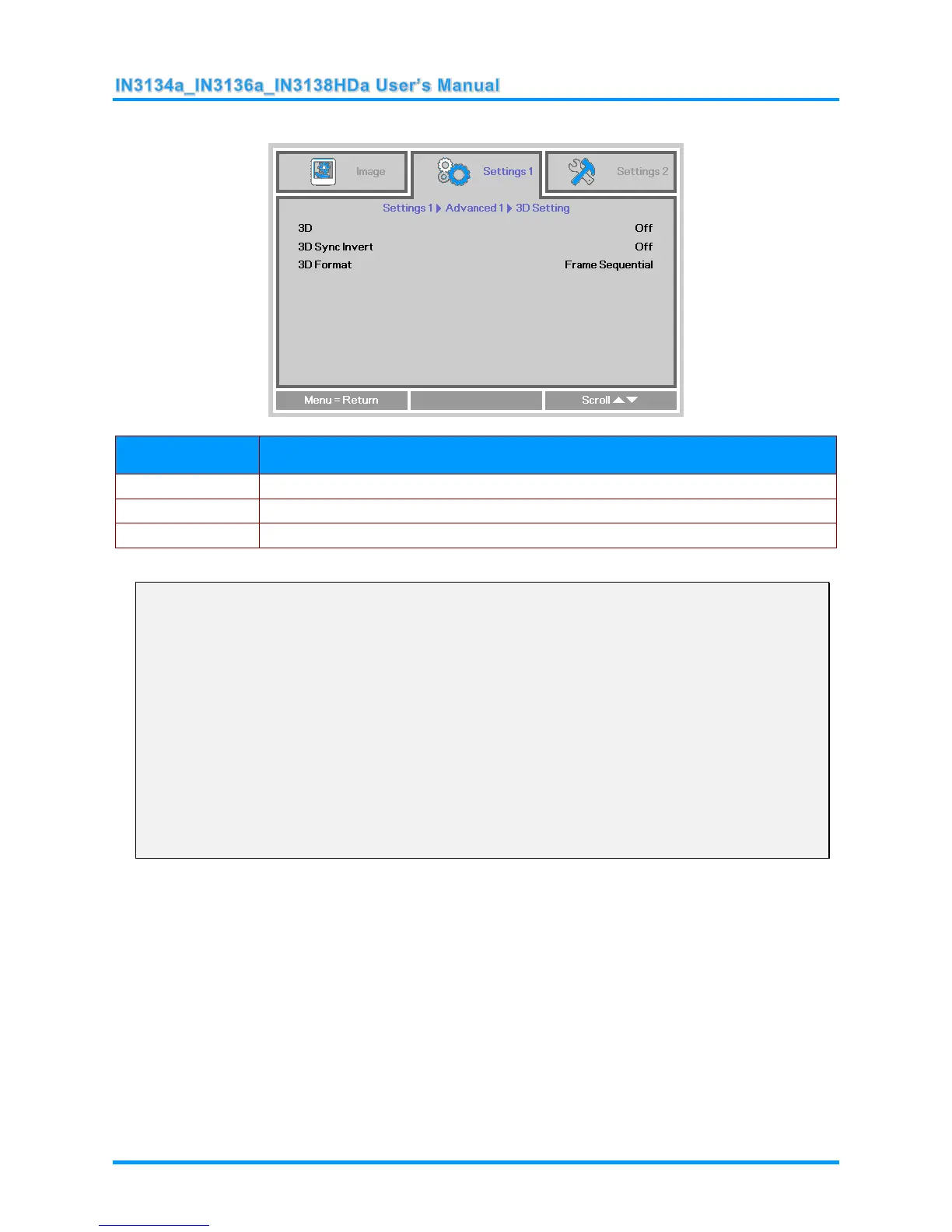 2. When the projector is connected to an appropriate 3D source, the 3D OSD menu items are available