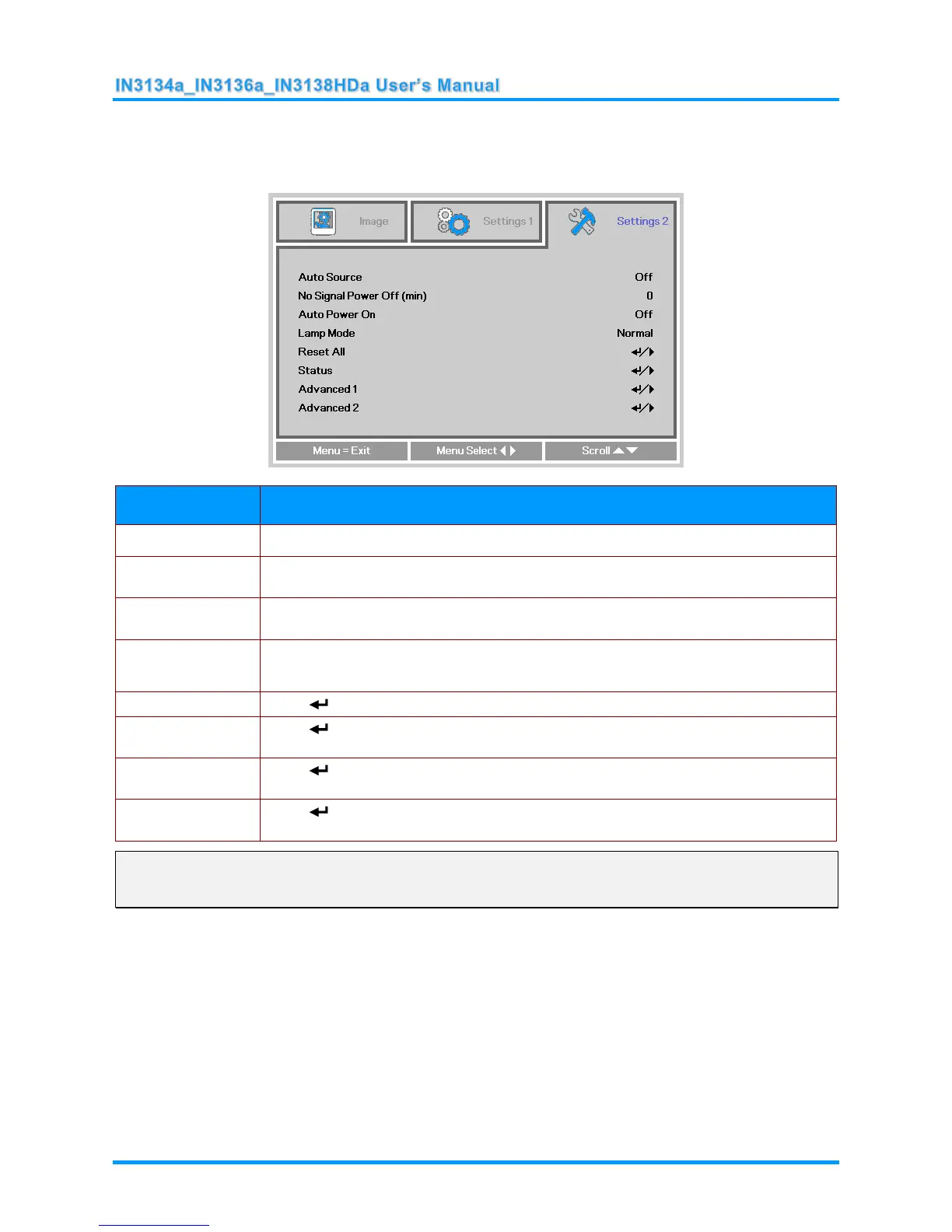Press the MENU button to open the OSD menu. Press the ◄► buttons to move to the Settings 2